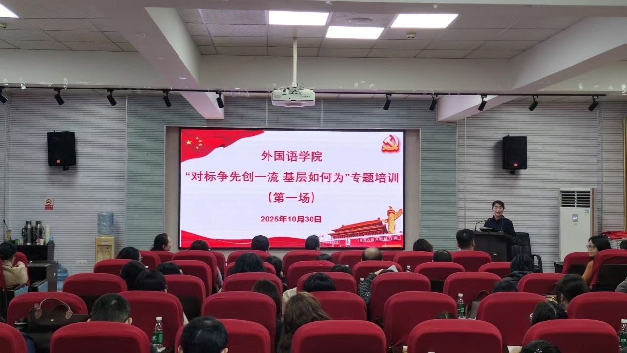 本网讯(通讯员 张新英) 10月30日与11月6日下午,外国语学院“对标争先创一流 基层如何为”专题培训在W6517会议室举行。学校党委副书记李红出席指导。