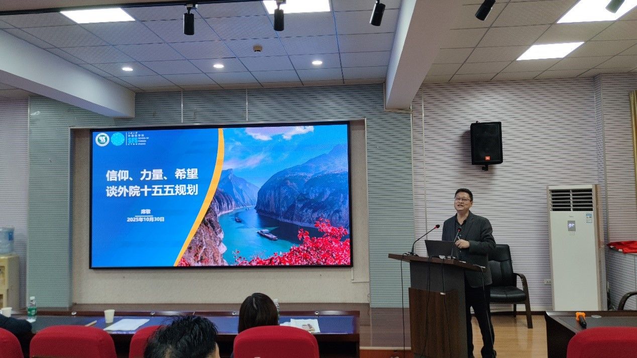 外国语学院院长席敬在以《信仰、力量、希望——谈外院“十五五”规划》为题的报告中,系统总结了“十四五”期间学院在学科建设、人才培养与科学研究等方面取得的进展,并深入分析了“十五五”阶段面临的机遇挑战与发展路径。