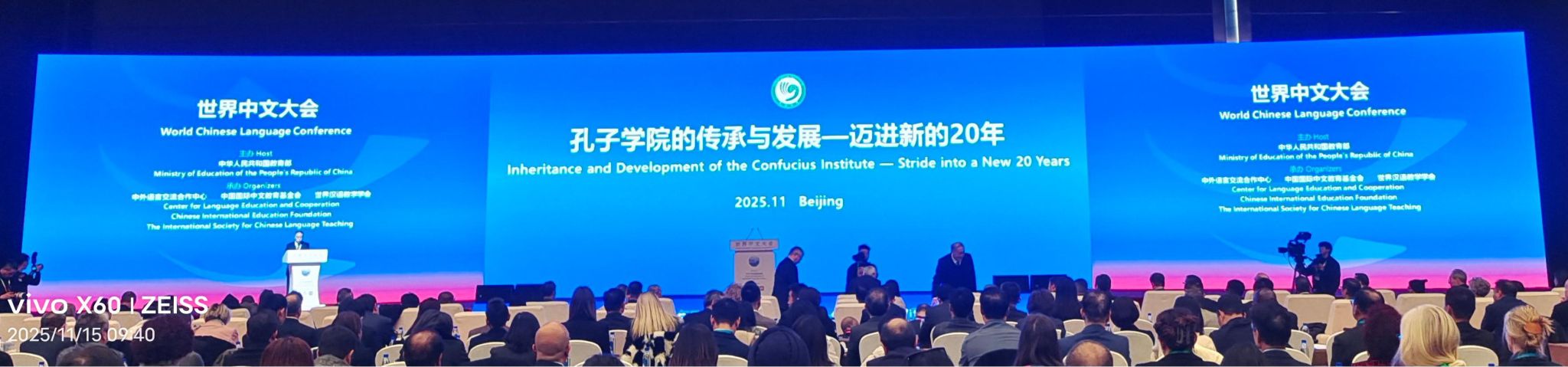 本次大会由中华人民共和国教育部主办,以“创新引领 数智赋能——让中文零距离”为主题,汇聚了来自全球160多个国家和地区的近2000名教育主管部门代表、国际组织负责人、高校领导者、专家学者及驻华使节等,共同探讨国际中文教育的发展路径。中共中央政治局常委、国务院副总理丁薛祥出席开幕式并发表主旨讲话。我校党委常委、副校长张锐率团参会,出席了开幕式、全体会议及“孔子学院的传承与发展——迈进新的20年”专题论坛等重要活动。