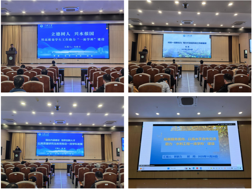 黄艳校长在总结点评中充分肯定了水利与环境学院在一流学科建设中的积极作为与领导班子的担当精神,并对下一阶段工作提出三点要求:一是强化科技创新,聚力产出高水平标志性成果;二是深化社会服务,提升在重大水利工程中的参与度与贡献度;三是加快智慧水利、生态水利等新兴交叉学科发展,全力以赴推动水利工程一流学科建设实现新突破。