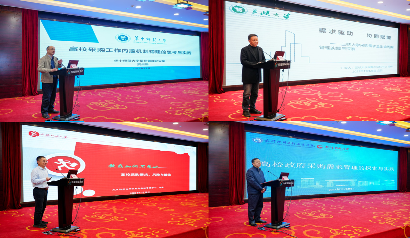 会上,湖北省财政厅政府采购管理处二级调研员颜国欢、华中师范大学国有资产管理处处长贺占魁、武汉纺织大学采购与招标管理中心主任郭俊、武汉软件工程职业学院财务处(招标中心)处长刘颂、三峡大学采购与招标中心主任周伟分别作主题发言。与会代表围绕采购需求管理、风险防控等议题展开热烈研讨。