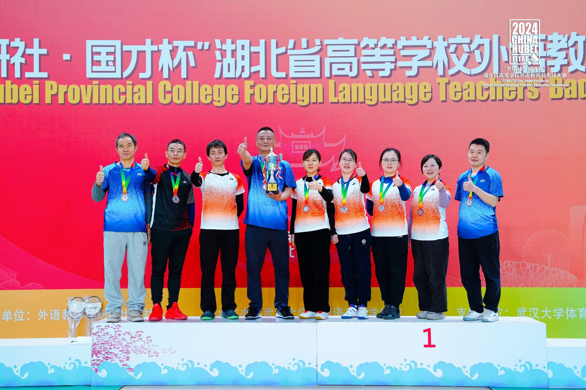 本网讯 2024年“外研社·国才杯”湖北省高等学校外语教师羽毛球大赛于2025年1月11-12号在武汉大学卓尔体育馆举行。本次比赛吸引了34支队伍280多人参与角逐,三峡大学外国语学院代表队顽强拼搏,力克群雄,最终以微弱比分差距惜败中南民族大学代表队,获得本次比赛亚军!