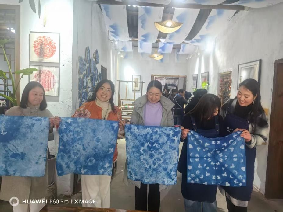 13点大家来到织布街兰染工坊。在这里,传统蓝染工艺的历史与技艺一一展开。非遗传承人现场教学,女性科技人才和女企业家们亲手体验蓝染制作,感受指尖上的非遗魅力。大家围绕非遗文化与现代商业的结合、产品市场化和品牌化的创新思路展开热烈探讨,碰撞出创意的火花,为传统文化的传承与发展寻找新的商业契机。