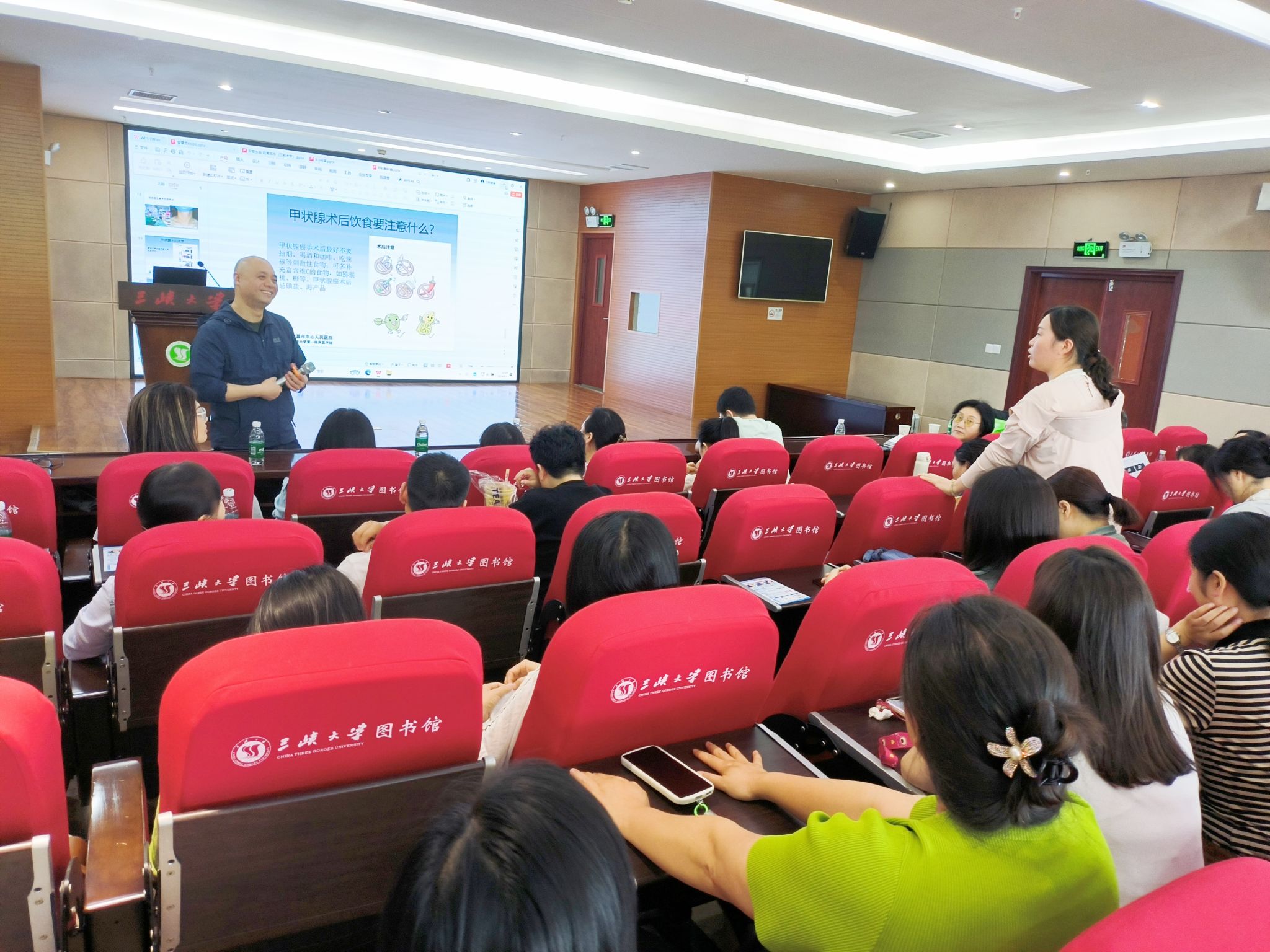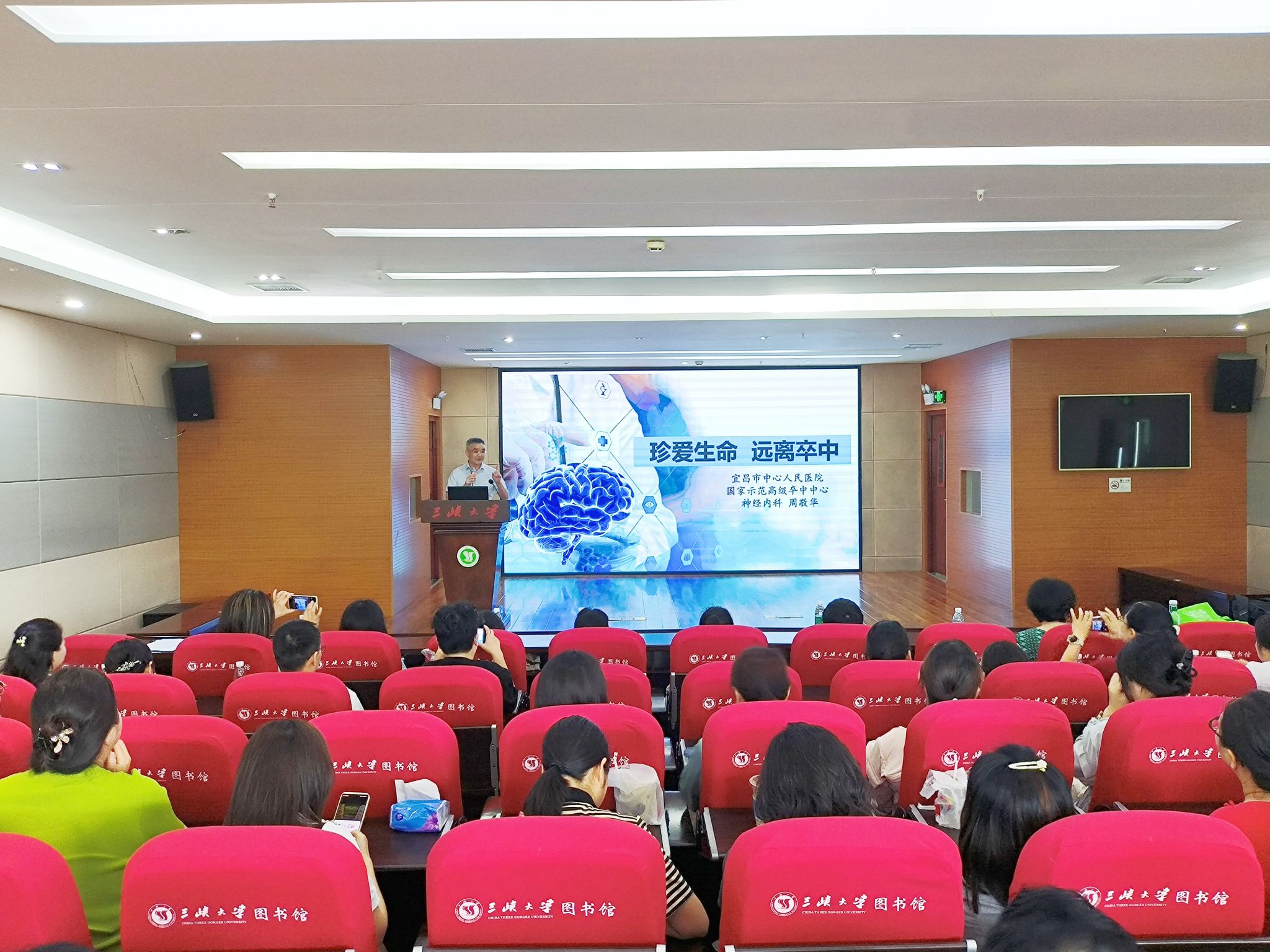 本次活动邀请了宜昌市中心人民医院甲乳外科主任医师谭宇彦和脑血管内科主任医师周敬华两位专家来校科普宣讲。谭宇彦以《乳腺健康》和《甲状腺的防治》为题,结合丰富的临床案例,从乳腺癌的临床表现、易患人群、自我检查和预防,以及甲状腺结节的病因、治疗方式、防治措施等方面进行了全面介绍;周敬华以《珍爱生命 远离卒中》为题,用图文并茂的方式详细讲解了脑卒中的危害、识别、急救和预防措施等内容,并再三叮嘱大家“时间就是大脑,大脑就是生命”,一旦发现相应症状须尽快就医早诊断、早治疗,并强调要以科学的生活方式降低脑卒中的发病率。