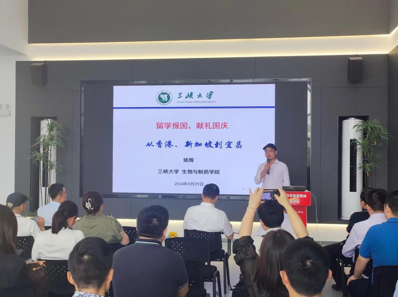 我校生物与制药学院的陈国华副教授、姚辉副教授,外国语学院的刘凌玲副教授等受邀参加了会议。其中,姚辉代表学校进行了精彩的宣讲。姚辉分享了自己在香港中文大学从事研究工作的经历以及在新加坡南洋理工大学攻读博士学位期间的所见所闻。他结合自身的留学经历,详细阐述了如何在海外学习期间汲取知识、开拓视野,并在归国后合理运用所学为家乡宜昌发展贡献力量的事迹。