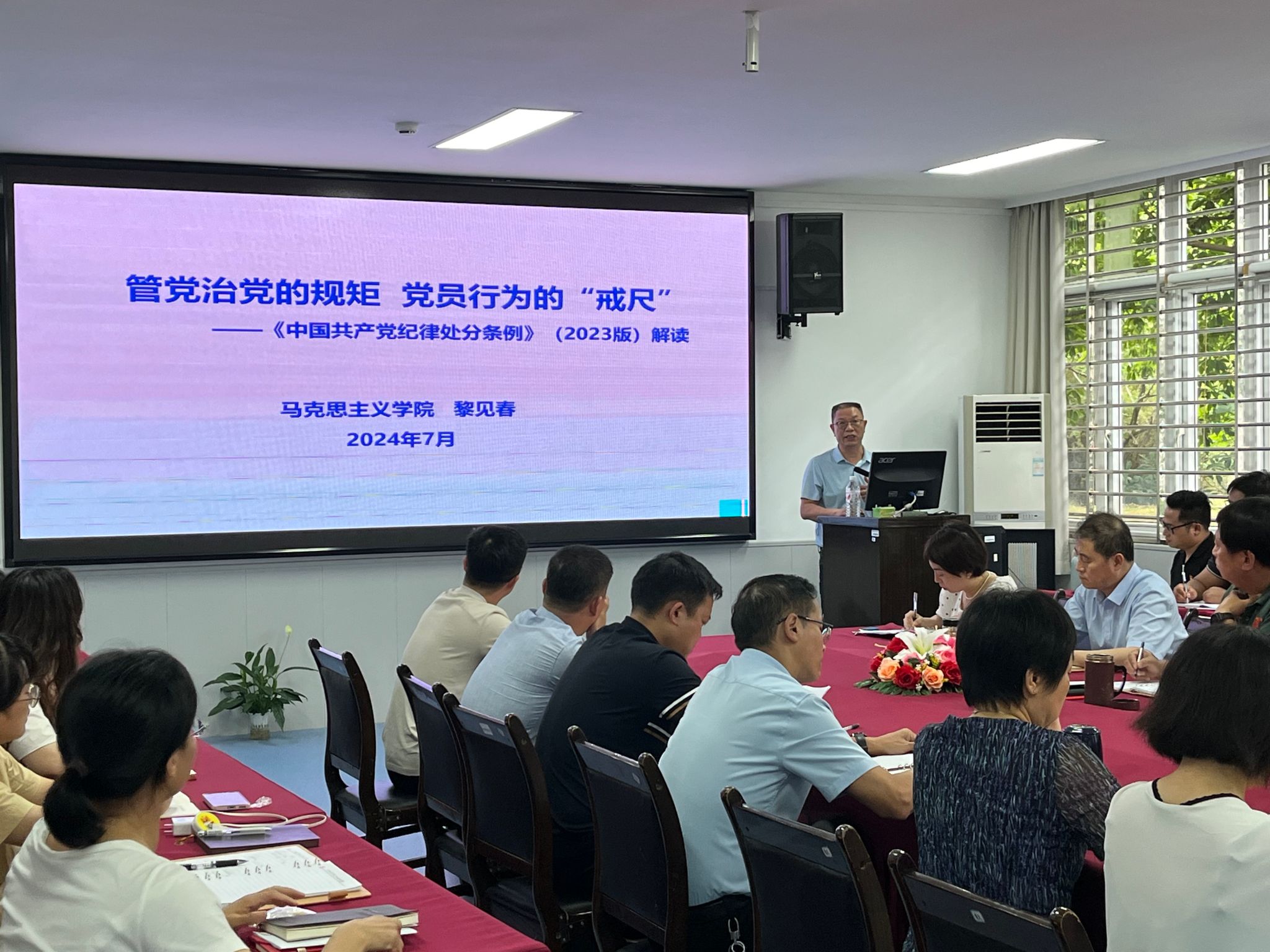 本网讯(通讯员 沈晶) 为深入开展党纪学习教育,提升党纪学习教育读书班学习质效,推动党纪学习教育走深走实,7月4日下午,健康医学院党委联合基础医学院党委邀请马克思主义学院黎见春教授开展专题辅导讲座。健康医学院和基础医学院党委理论学习中心组(扩大组)全体成员参加学习。讲座由健康医学院党委书记李新志主持。