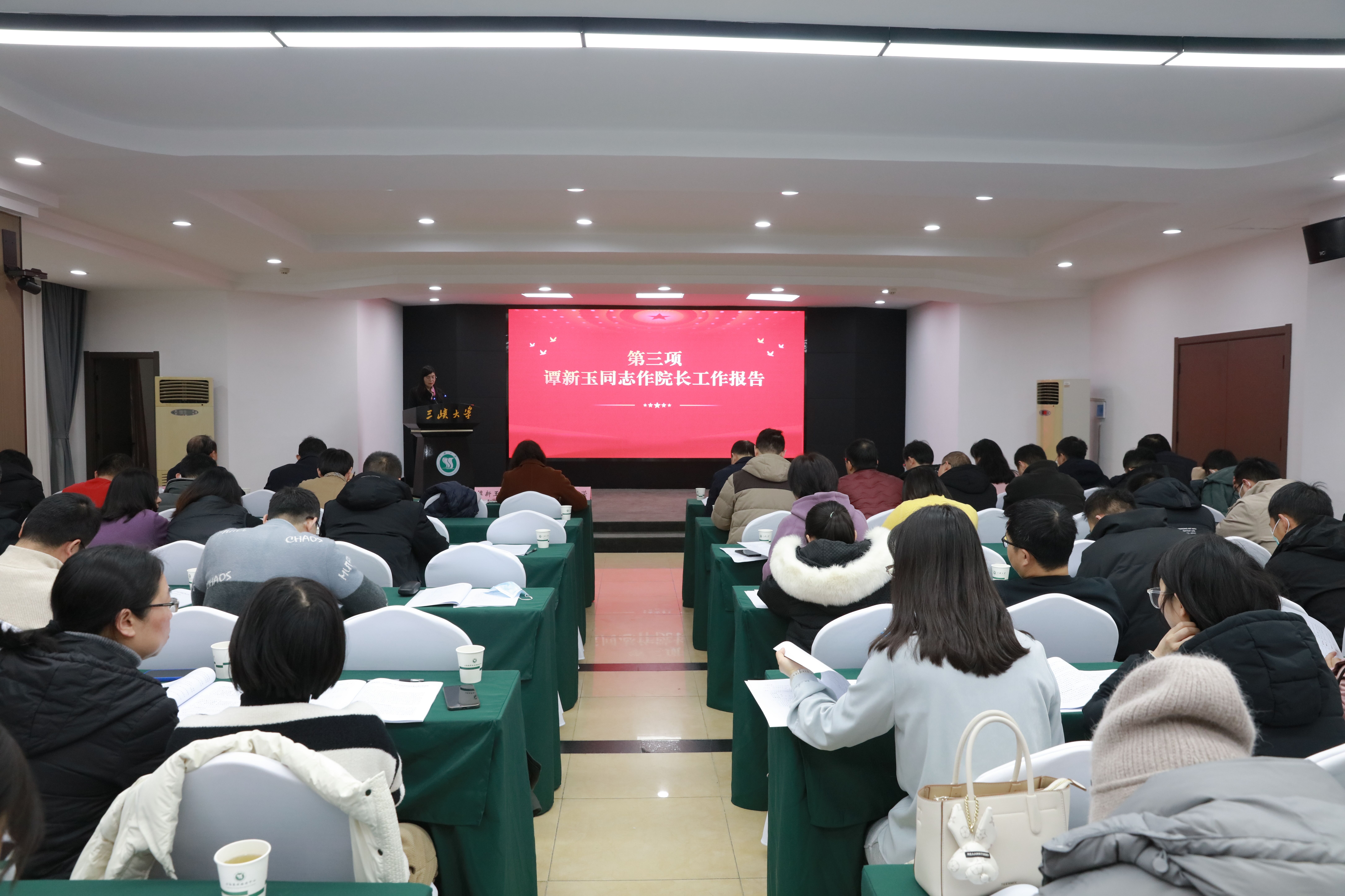 谭新玉代表材料与化工学院领导班子作了题为《强基固本、开拓创新,努力开创学院高质量发展的新局面》的工作报告,总结回顾了材料与化工学院2023年在学科建设、本科人才培养、研究生教育、社会服务与学术交流等方面的建设情况和发展成就,并部署了学院2024年的重点工作,提出了具体的发展目标与建设思路。谭新玉希望,全院教职工牢牢抓住千载难逢的社会对新能源、新化工井喷需求的大好机遇,迎难而上,努力开创学院高质量发展新局面。