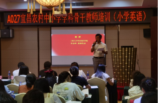 李志坤作为教师代表发言。他鼓励学员们积极转变角色,享受学习过程,并代表培训授课的教师团队承诺,将全力以赴,以满腔热情和专业的教学态度投入到课程中,为参训学员提供高质量的专业指导和支持。来自夷陵区乐天溪镇三峡小学的教师田覃丽作为学员代表发表了讲话。她表示,作为小学英语教师,他们肩负着乡村教育的希望,通过此次专业培训,他们将提升自身能力,并将所学应用于课堂教学,激发孩子们的英语学习兴趣,搭建起梦想与世界的桥梁,促进农村教育的均衡发展。