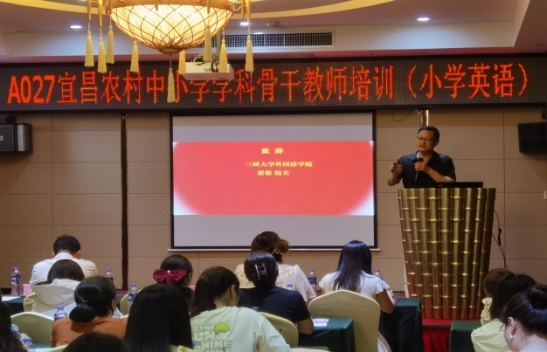 本网讯(通讯员 彭泓应) 7月8日,国培计划(2024)A027宜昌市农村中小学学科骨干教师培训项目(小学英语)开班典礼在宜昌市金德瑞国际酒店举行。三峡大学田家炳教育学院党委书记曾德贤,外国语学院院长席敬、副院长何婧、教师代表李志坤以及来自宜昌市所辖11个县市区的60名学员参加了本次活动。开班典礼由项目负责人、三峡大学外国语学院英语系主任刘君红主持。