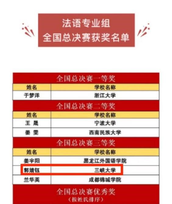 6月19日,2024年外研社“教学之星”大赛(多语种组)全国总决赛评比结果揭晓,外国语学院法语系教师郭婧钰取得法语专业组全国总决赛第五名的优异成绩,荣获三等奖。总决赛奖项设置一等奖1名,二等奖2名,三等奖3名,优秀奖若干名。