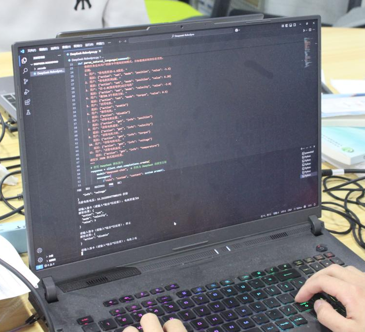 在学生的《自然与设计》课程学习与实践中,学生利用本地部署的DeepSeek平台搭建了电机智能控制系统。通过DeepSeek大模型的语义解析能力与电机控制技术结合,团队实现了使用自然语言控制电机转速、转向等功能。该系统可以通过文字指令直接驱动电机,通过输入自然语言,例如“以5.0(弧度每秒)的速度运行”、施加1牛米的力矩等,让电机直接完成相应的功能。同时还可以以实时对话的方式获取电机的运行状态等信息,方便调试。该项目成果进一步优化后可以应用于机械臂调试,具身机器人研发与调试等方面。