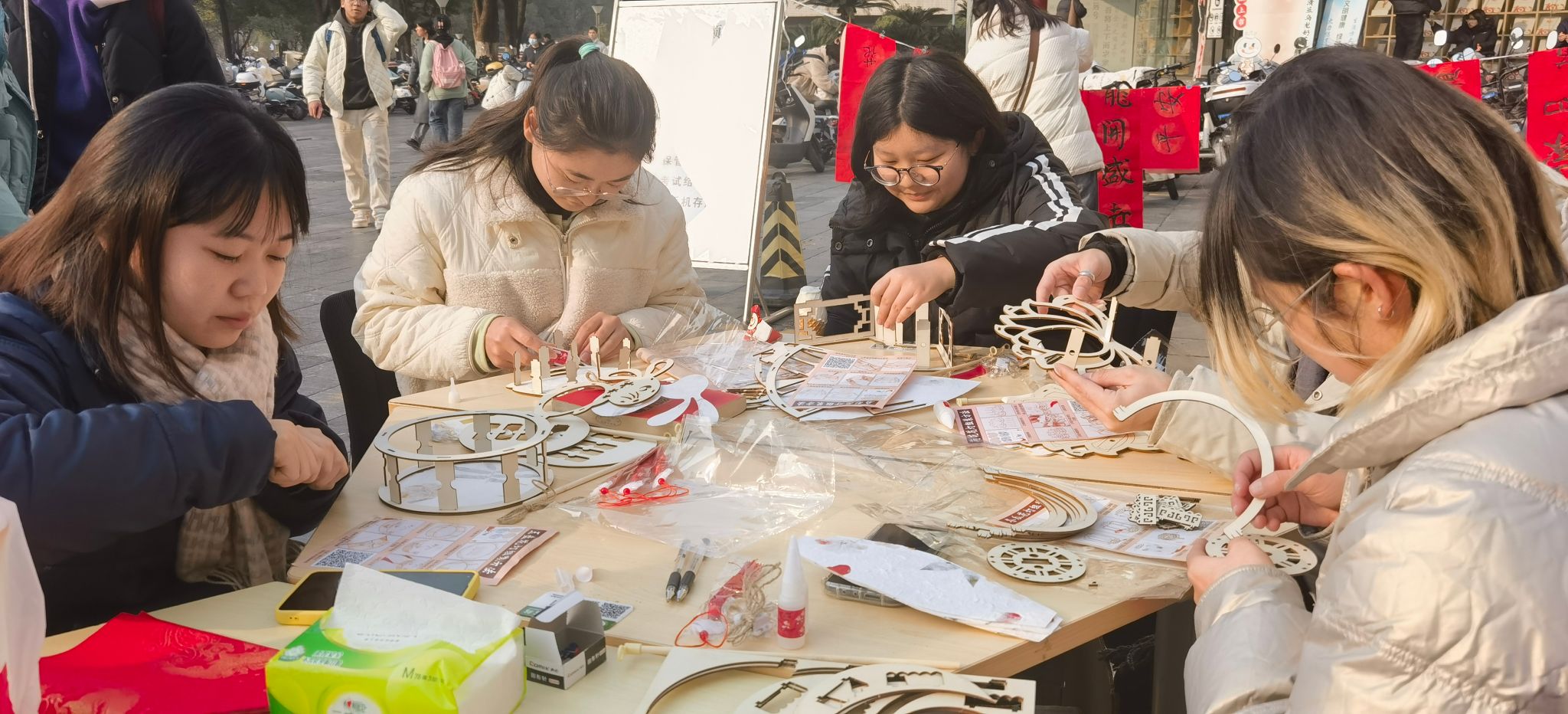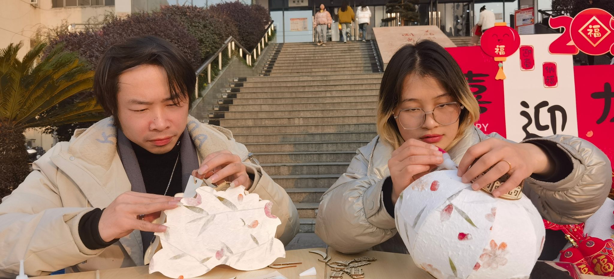 活动现场邀请了学校书画协会的书法爱好者们为师生写春联,送“福”字。感兴趣的师生纷纷挥毫泼墨亲自动手书写春联或者“福”字。除此之外,传统手工爱好者们也有发挥的场地,新春宫灯手工制作现场吸引了一批参与者,圆形宫灯、八角宫灯、扇形宫灯、荷花宫灯、兔子宫灯等形态各异的宫灯纷纷呈现在大家面前。不同颜色、不同造型的新春福袋很快完工,“好运常在”“平安吉祥”“家和福至”等各种美好的祝福既是对自己也是对家人的新年期盼。通过对宫灯和福袋的制作,让广大师生体验到了中国传统工艺的文化魅力。