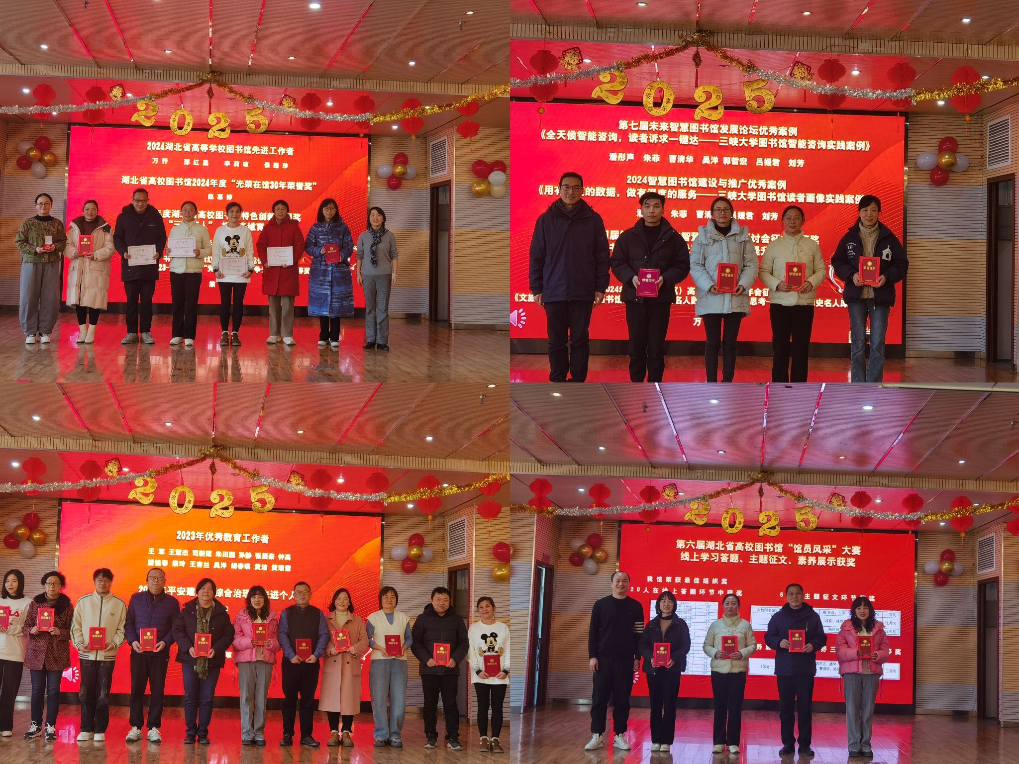 2024年是图书馆收获颇丰的一年,在全体馆员的努力下,图书馆获评2024年度目标考核优秀单位、优秀分工会、“党旗引领 百舸争先”工程一等奖等多项荣誉,满载而归。趣味运动会正式开始之前,馆长赵春华同志对2024年工作进行了总结,副馆长于海东与潘彤声同志分别对2025年分管工作进行了布置,同时,还进行了颁奖环节。馆领导分别为2024年湖北省高等学校图书馆先进工作者、湖北省高校图书馆2024年度“光荣在馆 30年荣誉奖”、2024年度湖北省高校图书馆特色创新单项奖、三峡大学2023-2024年度“党旗引领 百舸争先”工程一等奖、第六届湖北省高校图书馆“馆员风采”大赛等奖项颁奖。
