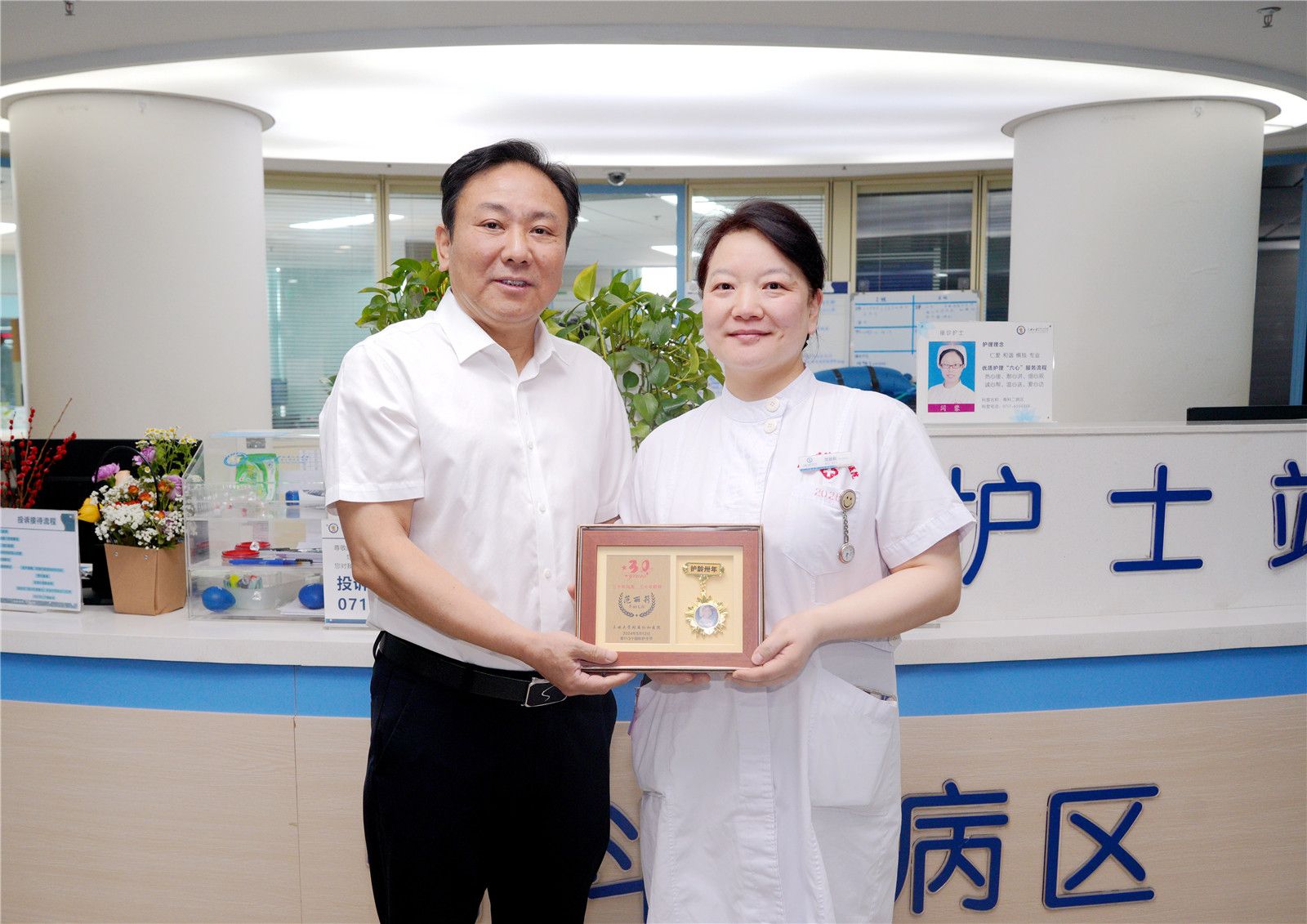 5月12日上午,医院领导分组到心胸大血管外科、消化内科、妇科、新生儿科、急诊科、整形美容门诊、血液净化中心等临床科室,与一线护理工作者们亲切交流,关心护士的工作、生活情况,并向坚守护理岗位30年的两位护士代表范丽莉和张芹颁发“从护三十年”纪念勋章。医院领导充分肯定了全体护士在守护人民健康事业中的付出与成果,并希望大家继续秉持“南丁格尔精神”,在“精准、创新、融合”上下功夫,让护理服务“既有力度、更有温度”。