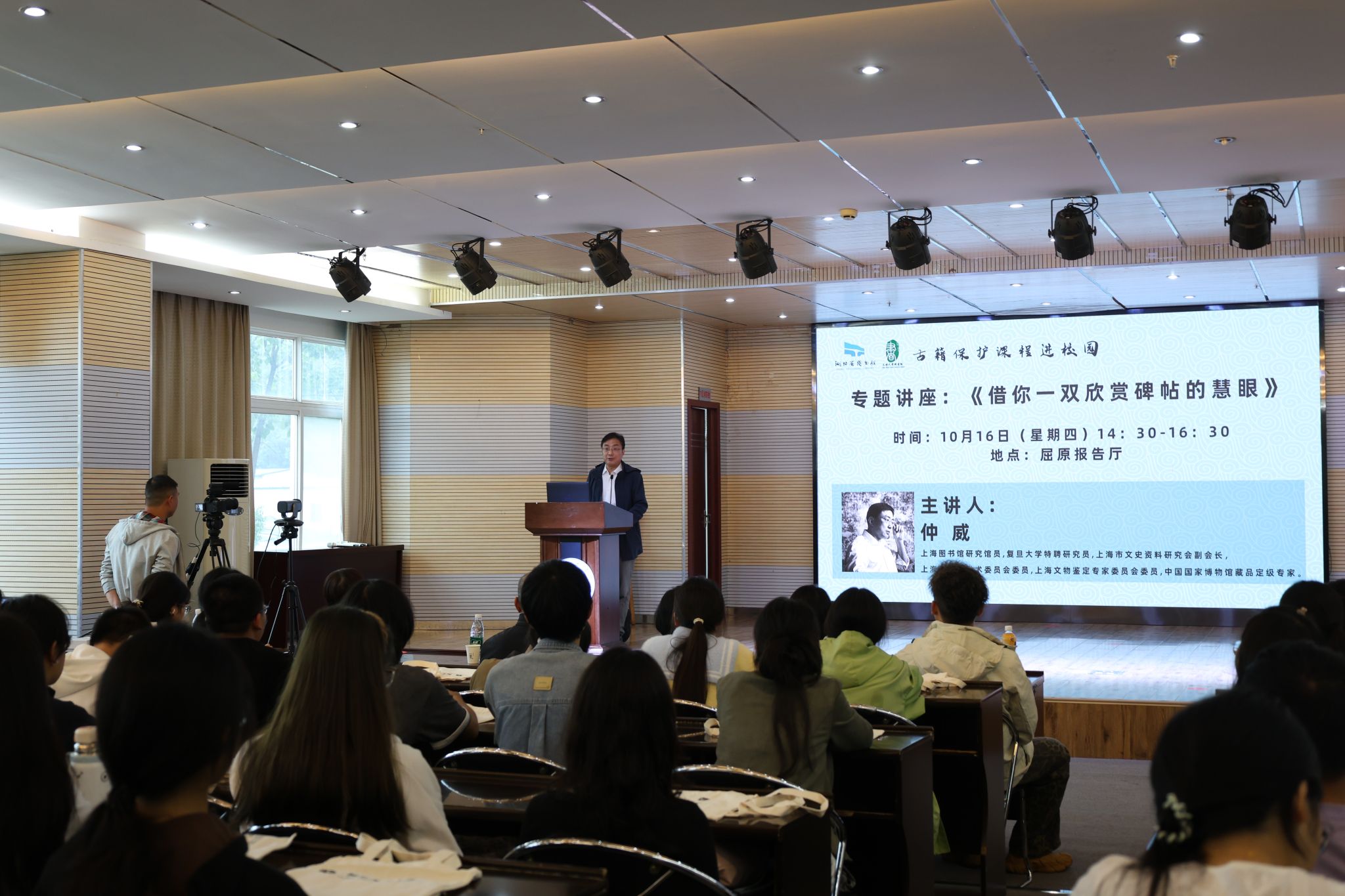 仲威研究员以《借你一双欣赏碑帖的眼睛》为题,围绕碑帖的选择、欣赏、鉴别与收藏四大核心维度,结合大量珍贵的碑帖实例,系统讲解了碑帖的分类标准、不同形式裱本的独特之处,以及题记在碑帖研究中的重要作用。其图文并茂的讲解,为在场师生开启了一场深入浅出的碑帖文化之旅。