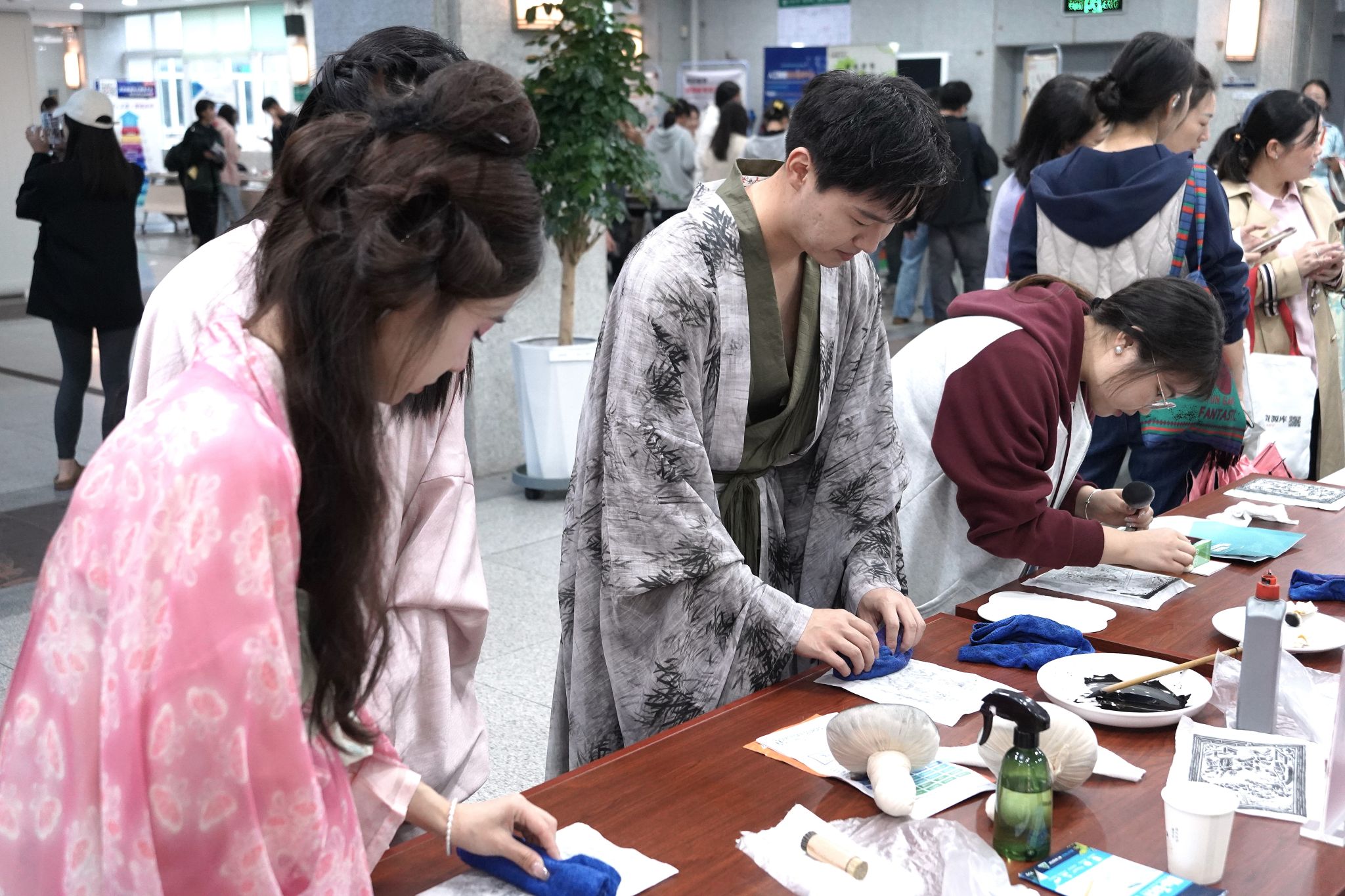 讲座期间,图书馆一楼大厅同步开展传拓体验活动。在湖北省图书馆专业老师的指导下,学生们踊跃参与,通过实践操作深化对古籍保护技艺的理解。
