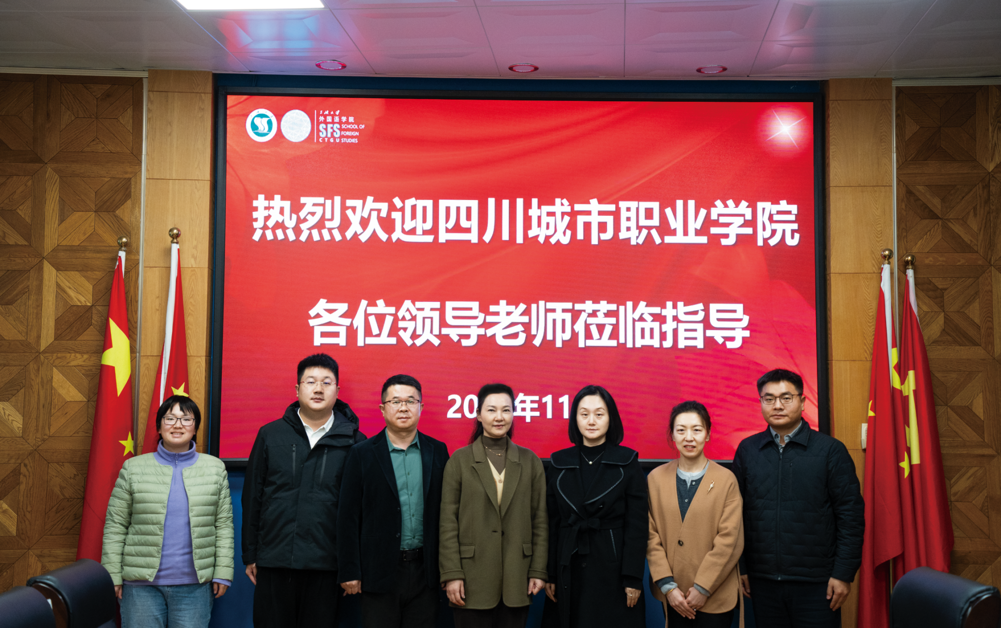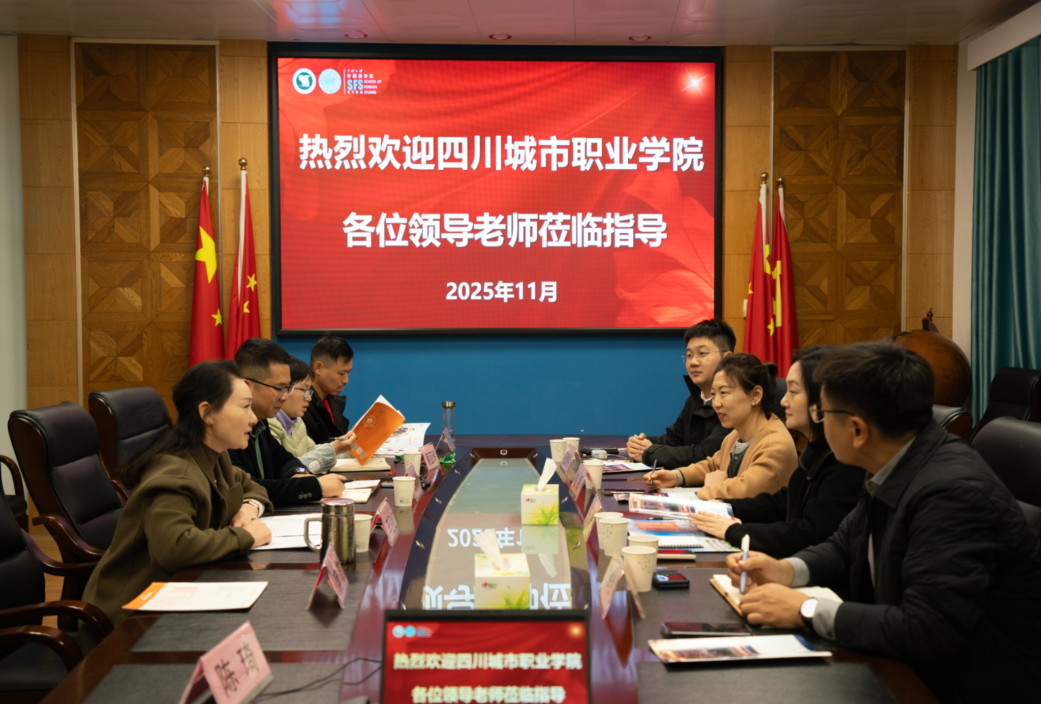 本网讯(通讯员 蔡亚玲 陈琦) 11月19日,四川城市职业学院党委委员、副校长王雁、城市建设与设计学院院长刘娜、产教融合办公室副主任李坤洋和孔顺伟老师一行到访我校外国语学院,双方围绕社会服务、涉外培训与对外合作新模式开展交流。交流会由外国语学院党委书记李卫红主持,学院党委委员胡新颖、党政办公室主任余征及出国境培训中心相关教师参加座谈。