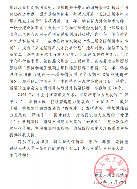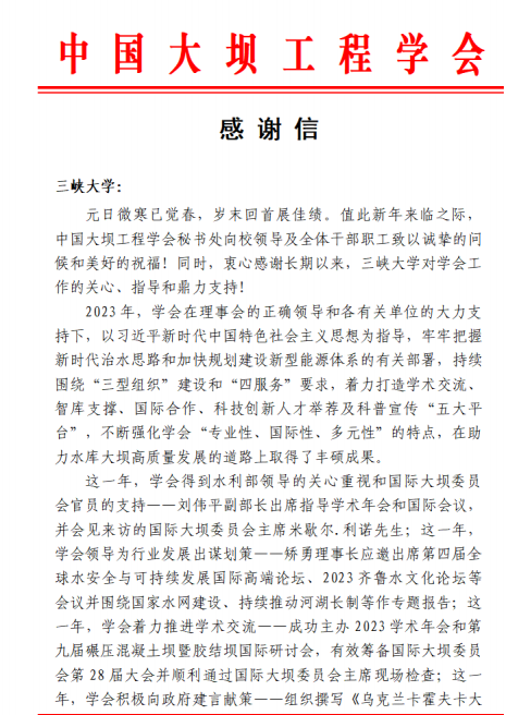 本网讯(通讯员 汤婧) 近日,中国大坝工程学会向我校发来感谢信,向我校长期以来对学会工作的关心、指导和支持表示感谢,同时也对学校校领导以及全体干部职工送上新年的诚挚问候和美好祝福。