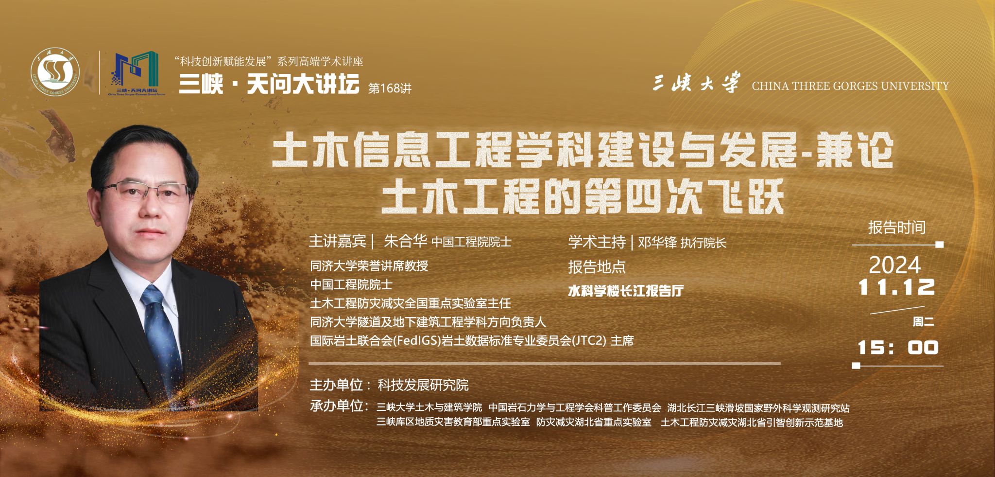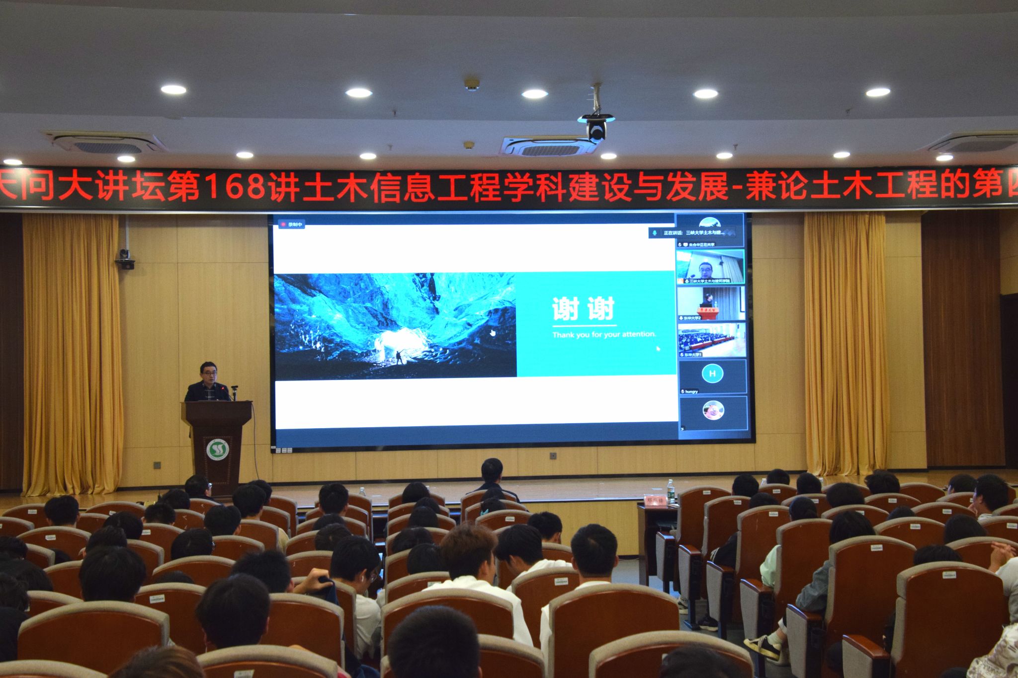 本网讯(通讯员 许钊) 11月12日下午,中国工程院院士、同济大学荣誉讲席教授、土木工程防灾减灾全国重点实验室主任、同济大学隧道及地下建筑工程学科方向负责人、国际岩土联合会(FedIGS)岩土数据标准专业委员会(JTC2)主席朱合华做客“三峡•天问大讲坛”第一百六十八讲,在长江报告厅为三峡大学师生做了题为《土木信息工程学科建设与发展-兼论土木工程的第四次飞跃》的学术报告。报告会由土木与建筑学院执行院长邓华锋教授主持,学院师生300余人聆听了报告。本次报告会由科技发展研究院主办、土木与建筑学院承办。