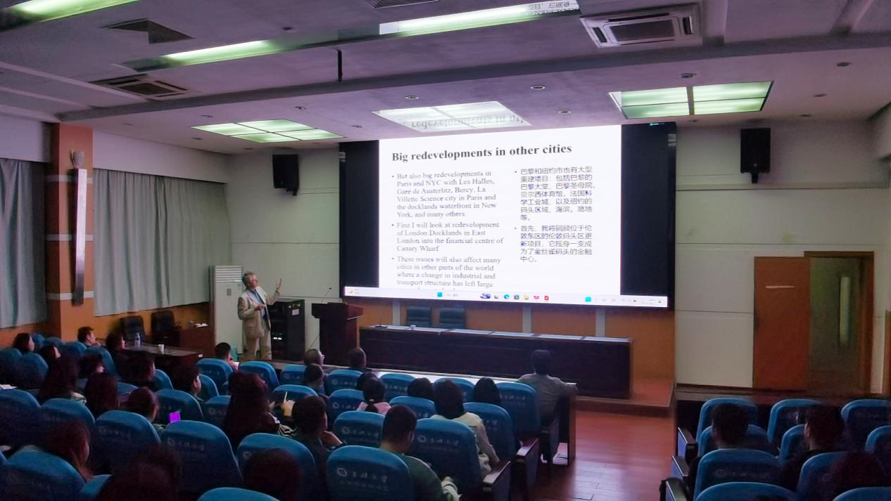 聘任仪式结束后,Hamnett 教授随即为师生们带来了一场精彩的学术报告。报告以“伦敦市中心的大规模更新”为主题,由城建系系主任许华华老师主持,吸引了土建学院一百余名师生参加。在报告中,Hamnett 教授凭借其深厚的学术造诣和丰富的实践经验,围绕伦敦市中心的码头、火车站等区域的城市更新中的土地利用问题展开了深入探讨。他不仅分享了国际先进的城市更新理念和方法,还结合北京钢铁厂重建案例,与师生们共同探讨国内城市更新的相关议题,提出了关于工业旧址、交通设施等存量用地再开发的创新思路。