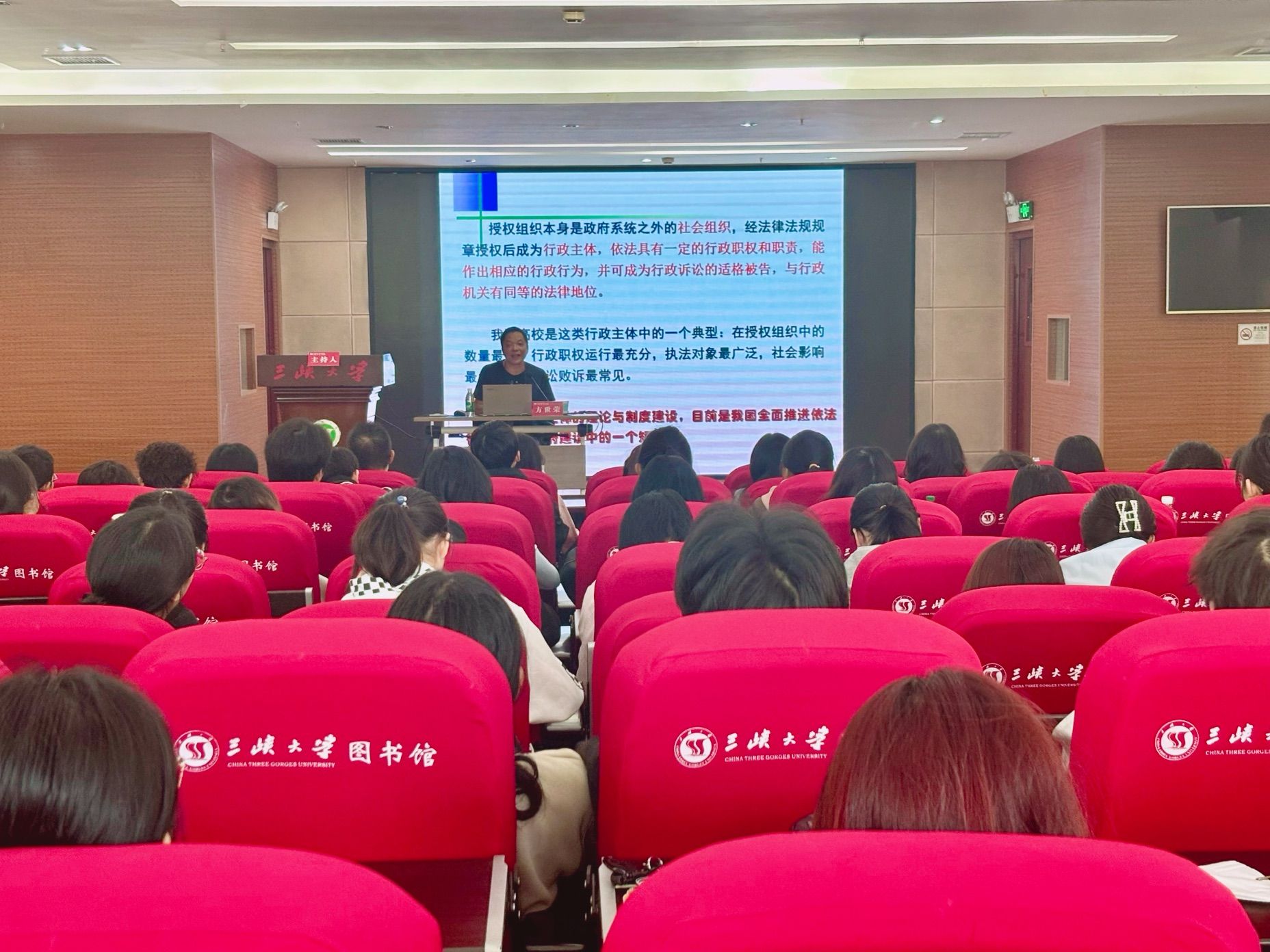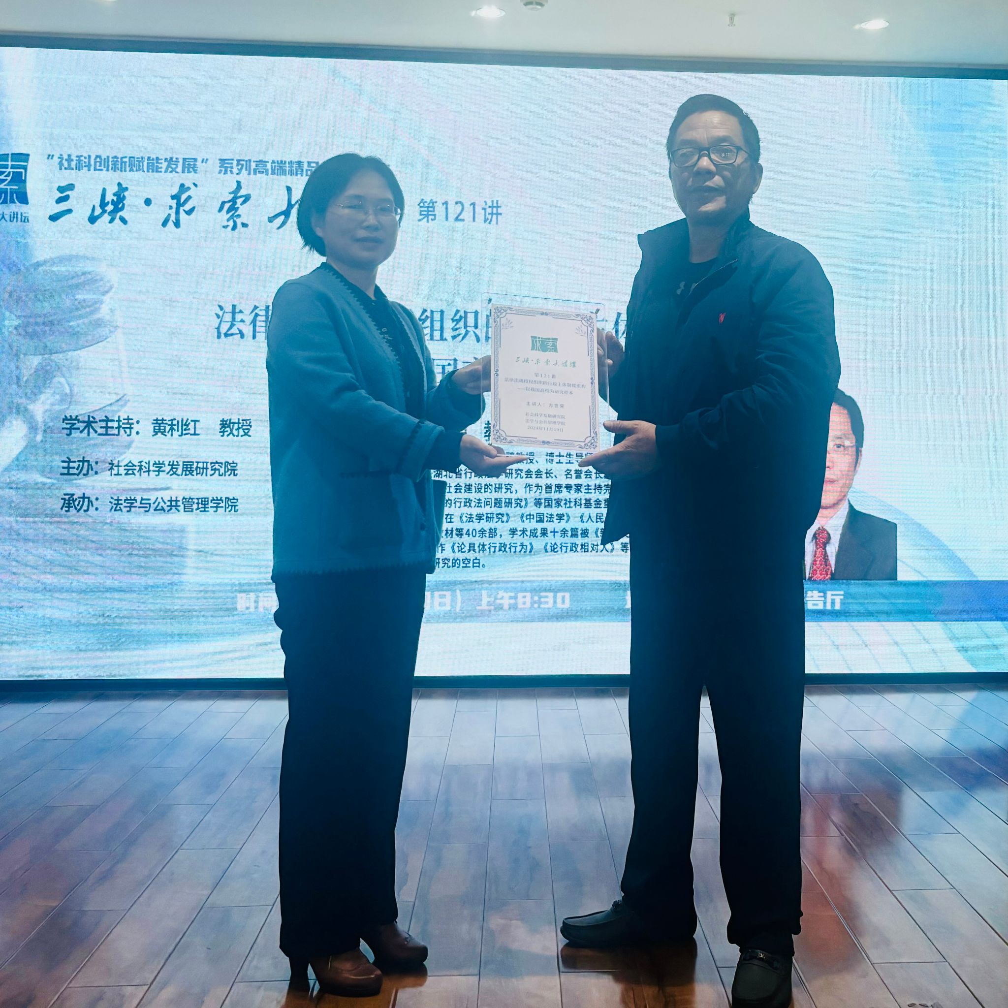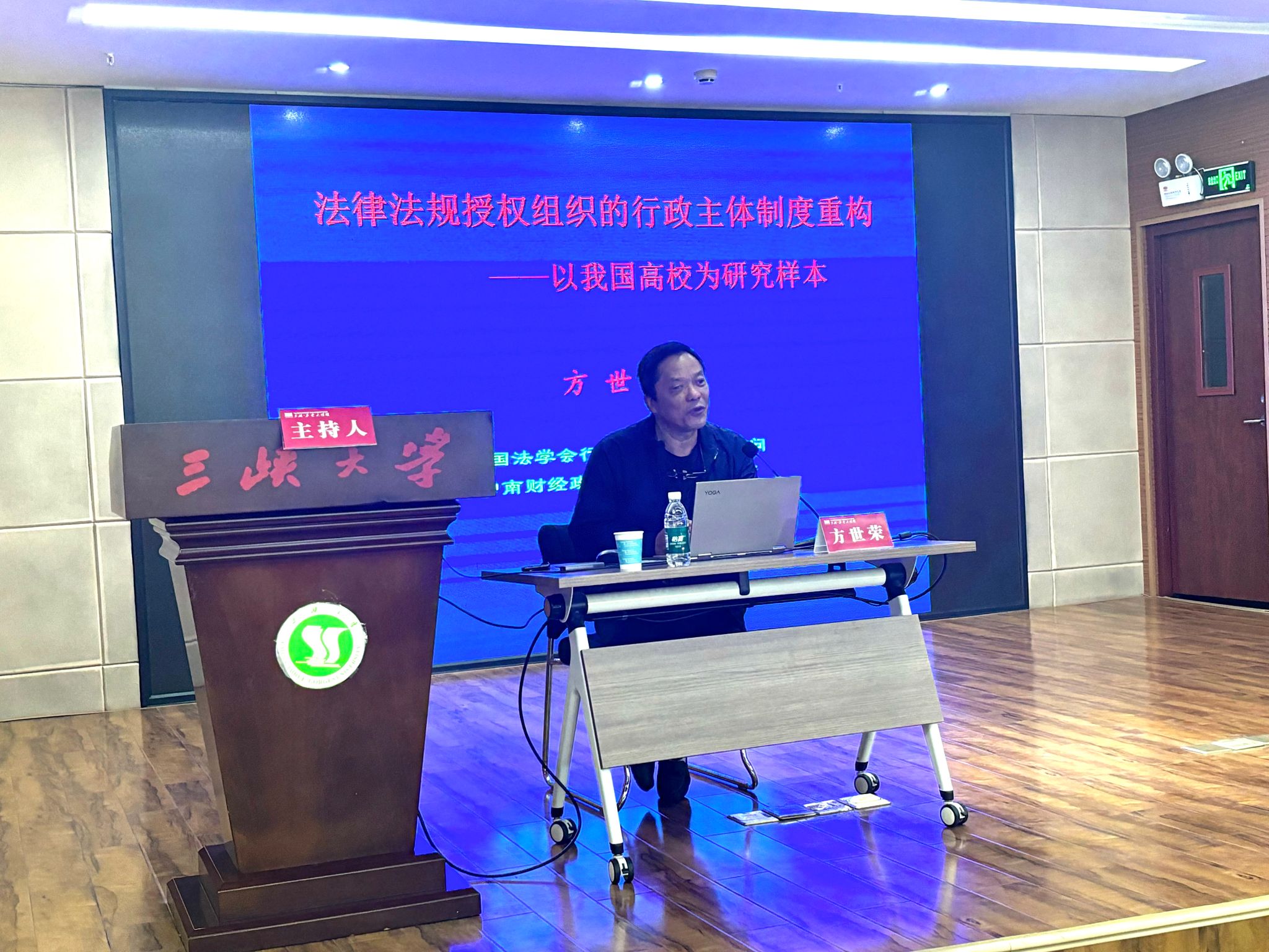 本网讯(通讯员 周妮 梁美琳) 11月10日上午,由社会科学发展研究院主办、法学与公共管理学院承办的“三峡·求索大讲坛”第121讲在图书馆昭君报告厅顺利举办。中国法学会行政法学研究会顾问、中南财经政法大学博士生导师方世荣教授应邀作了题为《法律法规授权组织的行政主体制度重构——以我国高校为研究样本》的学术报告。报告会由我校法学与公共管理学院副院长黄利红教授主持。法学与公共管理学院的百余名师生共同聆听了报告。