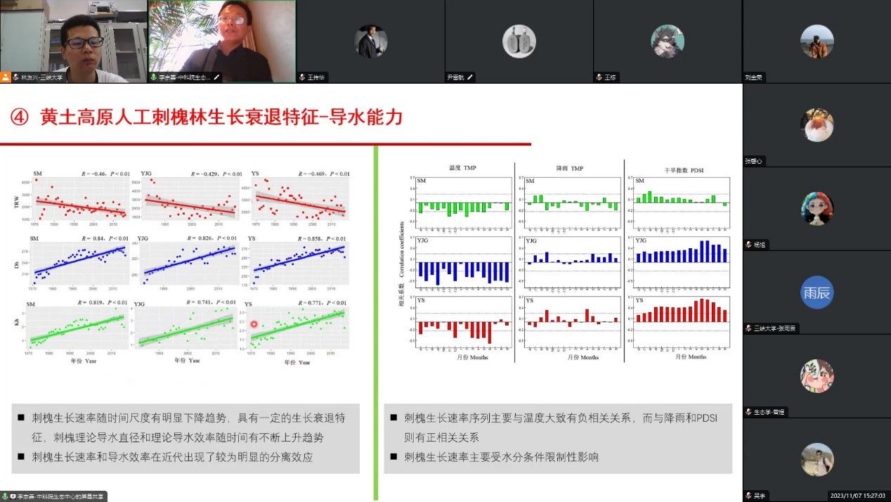 李宗善为大家作题为《黄土高原人工刺槐林生长衰退的树木年轮学证据》的学术报告。他详细介绍了树木年轮学的一些基本定义、研究方向,树木年轮学研究的基本实验流程,“黄土高原人工刺槐林生长衰退的树木年轮学证据”。并从利用树木年轮学的方法、从降水梯度、恢复年限、个体差异和导水能力四个方面验证了黄土高原人工刺槐林生长衰退的结论。与会人员紧紧围绕着三峡库区与树木年轮,结合自己的研究领域提出了一系列问题,李宗善作了耐心细致解答,现场学术交流讨论氛围浓厚。