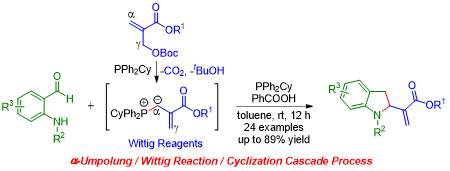 研究成果三题为“FacileSynthesis of 2-Vinylindolines via aPhosphine-Mediated α-Umpolung/WittigOlefination/CyclizationCascadeProcess” (Chemical Communications, 2024, 60,DOI:10.1039/D4CC01851F.)。吲哚啉是许多药物、天然产物以及生物活性分子中常见的结构单元,具有广泛的生物学和药理学活性。该论文以廉价易得的邻氨基苯甲醛和MBH酯为原料,在有机膦试剂的作用下,通过极性反转/Wittig烯化/环化串联反应的策略得到一系列2-取代吲哚啉类化合物,并且通过中间体捕捉、氘代实验等对可能的反应机理进行了研究,最后通过克级规模反应和衍生化反应证明了该方法的适用性,为吲哚啉衍生物的合成提供了一种新方法。