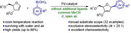 研究成果一题为“Stereocontrolled Synthesis of Aryl C-Nucleosides under Ambient Conditions” (Organic Letters, 2024, 26,DOI: 10.1021/acs.orglett.4c01664.)。碳核苷是一类非典型的核苷,与DNA/RNA中C-N糖苷键不同的是,碳核苷是通过C-C糖苷键与糖受体相连。由于C-C键比天然的C-N键更稳定,不易受到化学水解和酶降解的影响,因此碳核苷在药物研发中扮演着重要的角色。该论文提出了一种温和条件下立体可控合成碳核苷的方法。该方法以D-核糖烯和芳基硼酸为原料,在室温敞开体系中,钯催化下实现了高立体选择性合成芳基β-碳核苷。此外,该研究已成功应用于天然产物与药物的结构改造中,为新药开发提供了一种实用、简便的策略。