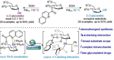研究成果二题为“Palladium-Catalyzed O-Glycosylation through π–π Interactions” (Organic Letters, 2024, 26,DOI: 10.1021/acs.orglett.4c02019.)。糖苷化反应是将糖分子连接到其他糖、蛋白质、脂质、天然产物或药物上的反应,是糖化学和糖生物学的核心。该论文提出了一种新型的立体多样性O-糖苷化策略。该策略以3-O-喹啉酰基-D-葡萄糖烯糖为原料,在60 ℃ 和110 ℃下与醇、单糖和氨基酸发生反应,两个温度条件分别控制得到一系列高立体选择性的β-O-糖苷的和α-O-糖苷。此外,通过反应机理研究和DFT计算发现,喹啉基团与膦配体的芳基形成了π-π堆叠作用,降低了C3基团离去的能垒,从而实现了立体选择性可控。该方法已成功应用于临床药物和天然产物的后期糖基化修饰以及复杂四糖的合成,充分证明了该方法的科学意义。