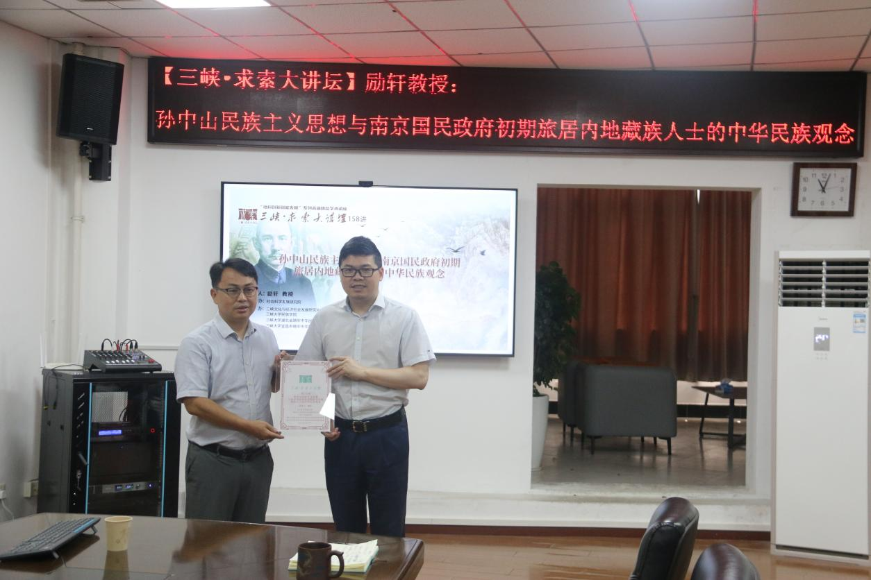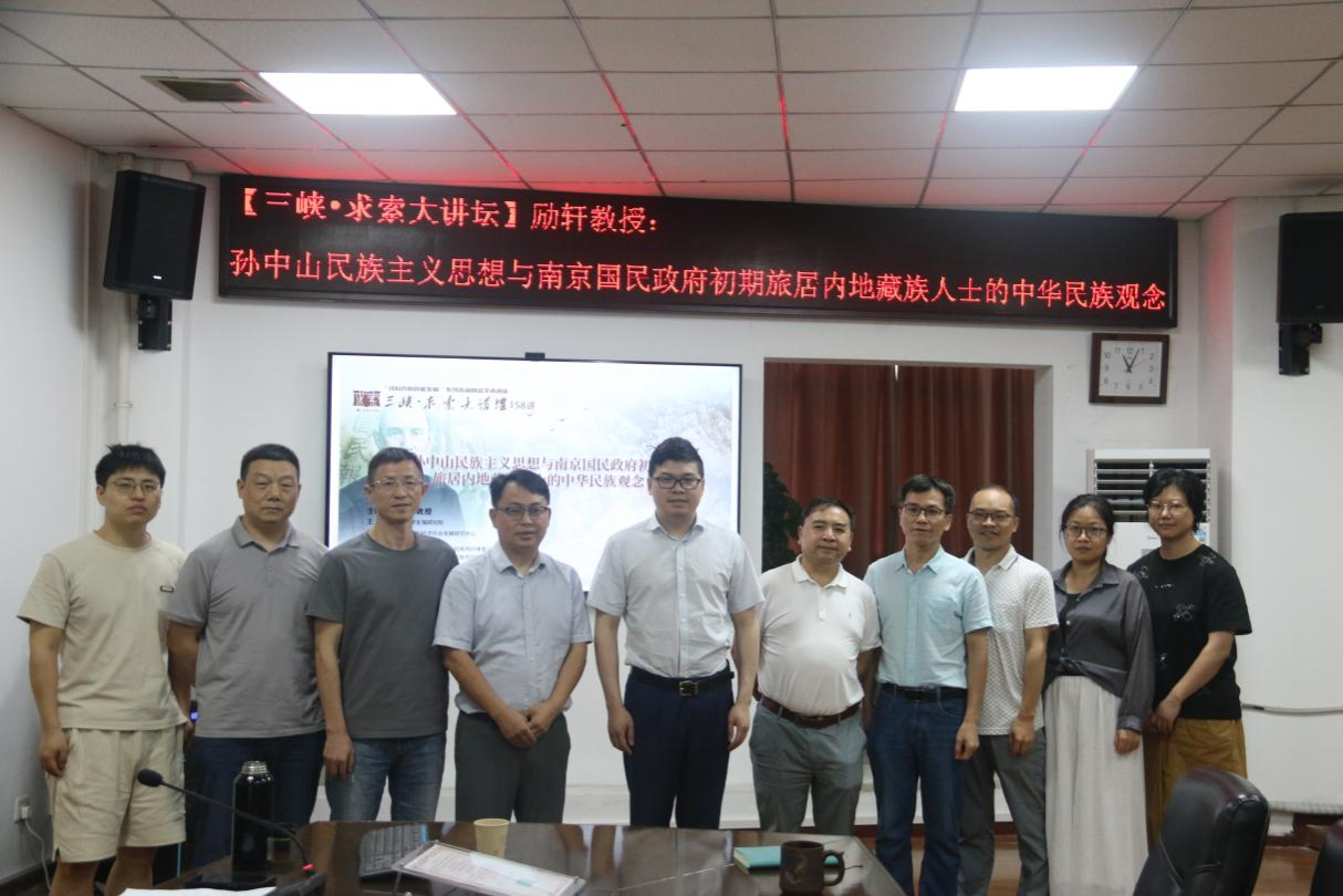 本网讯(通讯员 李雪儿 唐婷)6月30日上午,由社会科学发展研究院、三峡文化与经济社会发展研究中心、民族学院、三峡大学湖北省铸牢中华民族共同体意识研究基地、三峡大学宜昌市铸牢中华民族共同体意识研究基地共同主办的求索大讲坛第一百五十八讲在G-1203会议室顺利举行。四川大学励轩教授应邀作了题为“孙中山民族主义思想与南京国民政府初期旅居内地藏族人士的中华民族观念”的学术讲座。本次讲座由民族学院党总支书记、执行院长曹大明教授主持。民族学院全体师生聆听了此次讲座。