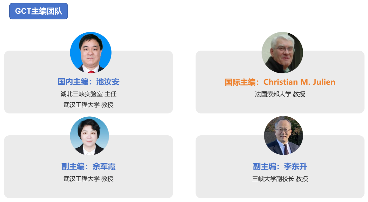 GCT国内主编由湖北三峡实验室主任、武汉工程大学教授池汝安担任,国际主编由法国索邦大学教授Christian M. Julien担任。三峡大学副校长李东升教授、武汉工程大学余军霞教授担任期刊副主编。