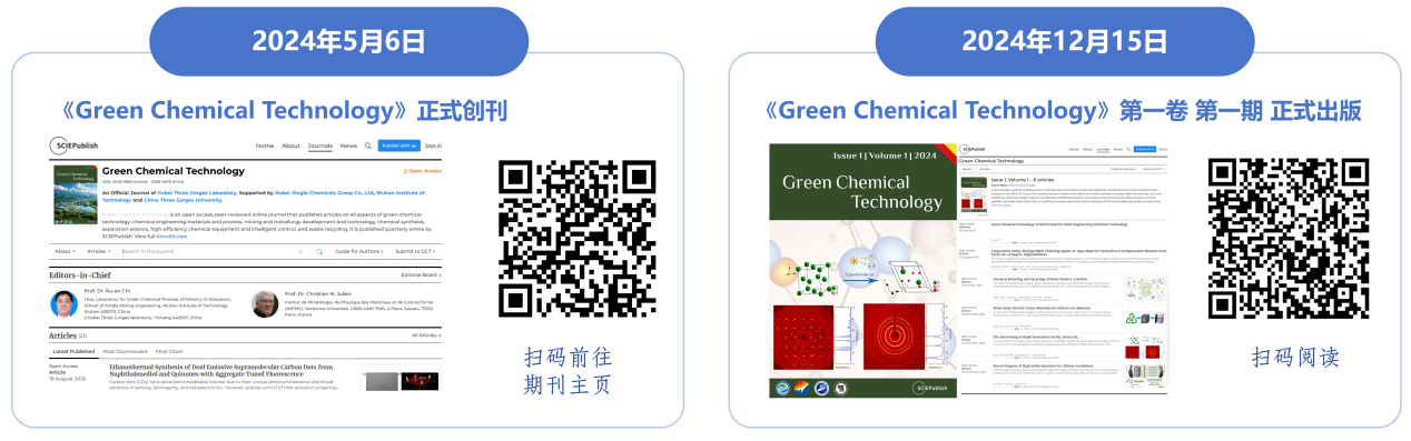 GCT聚焦绿色化工技术创新和学科前沿,内容涵盖化学工程材料和过程、矿业和冶金技术、化学合成、分离科学、高效化工设备和智能控制、废物资源化等研究领域重要进展和创新成果,旨在提供有价值的信息和深入的见解。所有文章通过期刊官方网站(https://www.sciepublish.com/journals/gct)、三峡实验室官网(https://www.hbsxsys.com/)、微信公众号及其他国内外传播渠道广泛宣传。