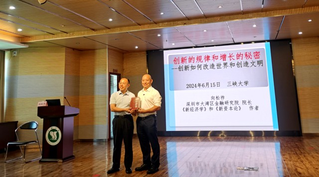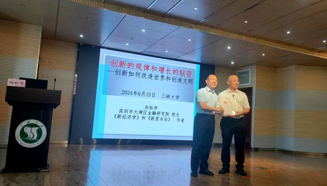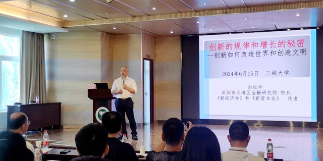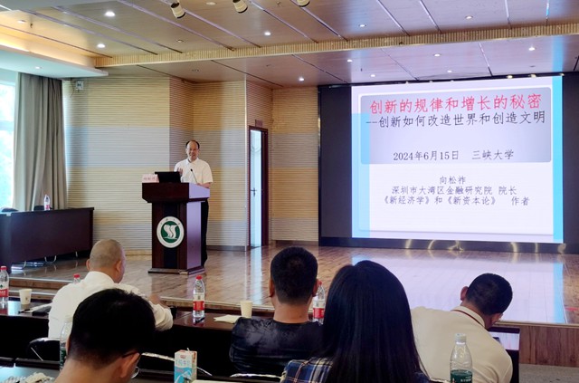 本网讯(通讯员 陈可) 6月15日上午,由社会科学发展研究院主办、经济与管理学院承办的“三峡·求索大讲坛”第107讲在图书馆屈原报告厅举行。中国农业银行前首席经济学家、深圳市大湾区金融研究院院长向松祚教授应邀作了题为《创新的规律和增长的秘密——创新如何改造世界和创造文明》的学术报告。报告会由学校党委书记何伟军主持,社会科学发展研究院院长王守文、经济与管理学院党委书记田野、经济与管理学院执行院长赵旭等百余名教师、研究生,共享了这场期待已久的学术盛宴。