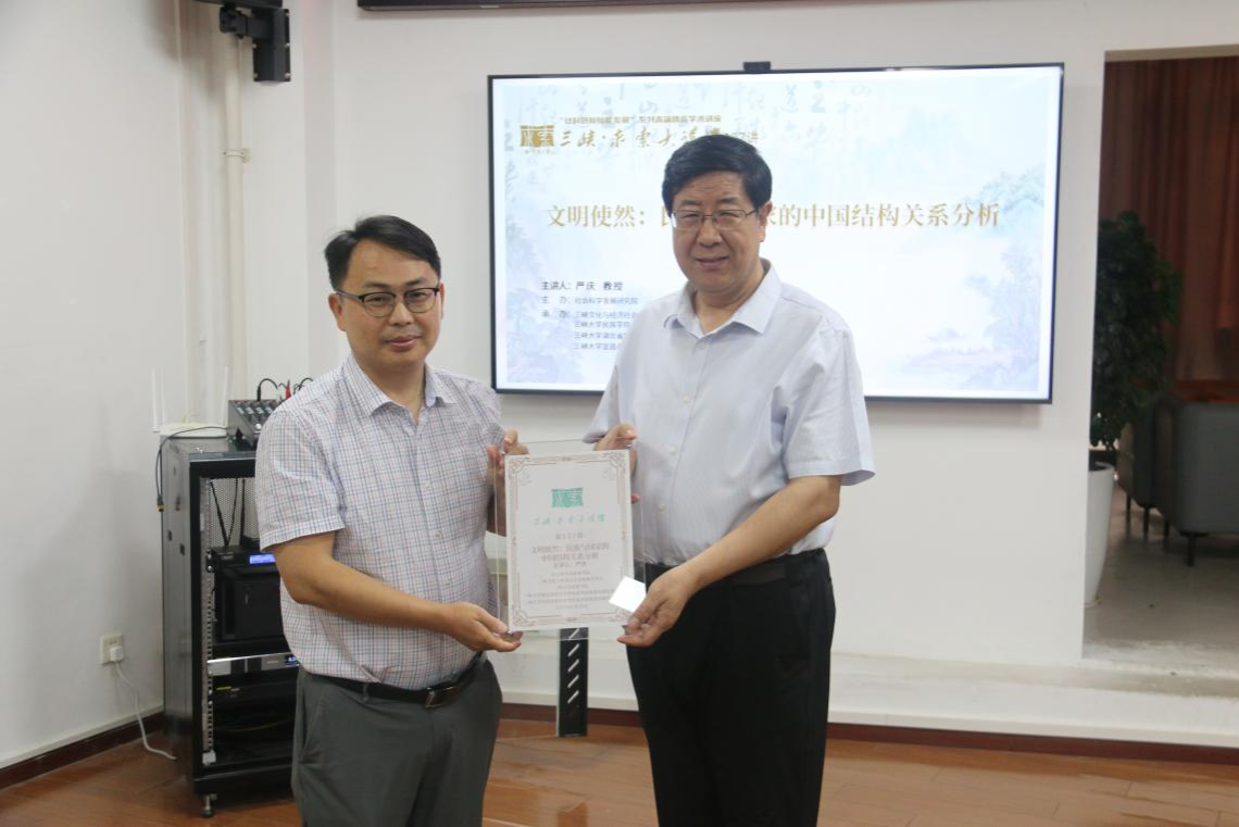 本网讯(通讯员 唐婷 刘雪娇)6月29日上午,由社会科学发展研究院主办,民族学院、三峡文化与经济社会发展研究中心、三峡大学湖北省铸牢中华民族共同体意识研究基地承办的“三峡·求索大讲坛”第一百五十七讲在G-1203会议室举行。中央民族大学教授、博士生导师,国家级人才,中国民族理论学会常务理事严庆教授作了题为“文明使然:民族与国家的中国结构关系分析”的学术讲座。本次讲座由民族学院党总支书记、执行院长曹大明教授主持。民族学院全体师生聆听了讲座。