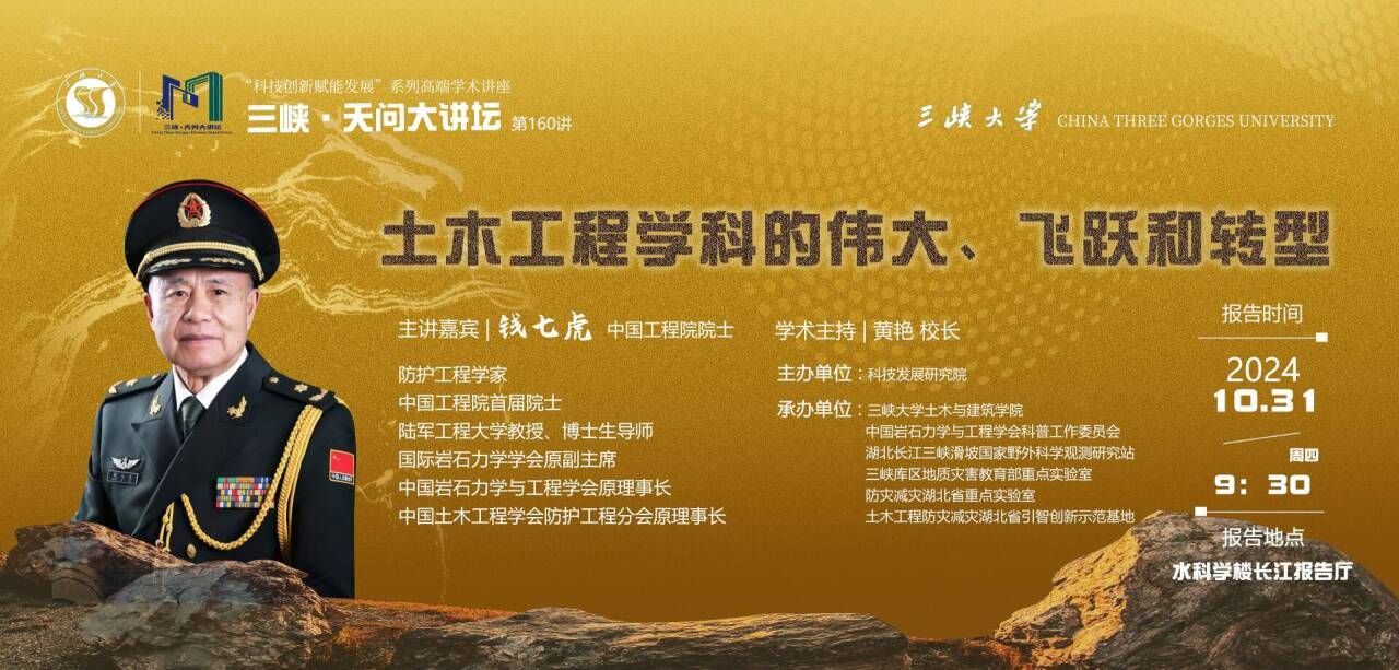 本网讯(通讯员 蔡悦曼)10月31日上午,中国工程院首届院士、陆军工程大学教授、博士生导师钱七虎做客“三峡•天问大讲坛”第一百六十讲,通过线上方式在长江报告厅为三峡大学师生做了题为《土木工程学科的伟大、飞跃和转型》的学术报告。报告会由校长黄艳教授主持,校学术委员会主任李建林教授及土木与建筑学院师生500余人聆听了报告。本次报告会由科技发展研究院主办、土木与建筑学院承办。