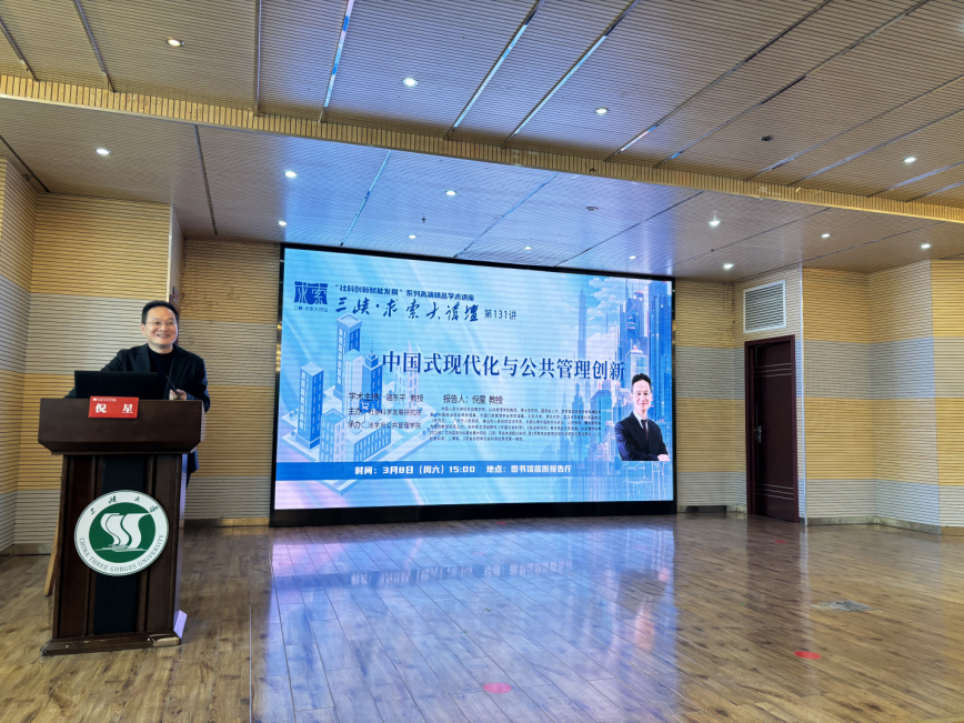 本网讯(通讯员 万兰芳 赵颖/文 周妮/图)3月8日下午,由社会科学发展研究院主办、法学与公共管理学院承办的“三峡·求索大讲坛”第131讲在图书馆屈原学术报告厅顺利举行。本次报告会特邀中国人民大学纪检监察学院、公共管理学院倪星教授主讲,围绕“中国式现代化与公共管理创新”主题与现场师生进行了分享。报告会由法学与公共管理学院院长骆东平教授主持。