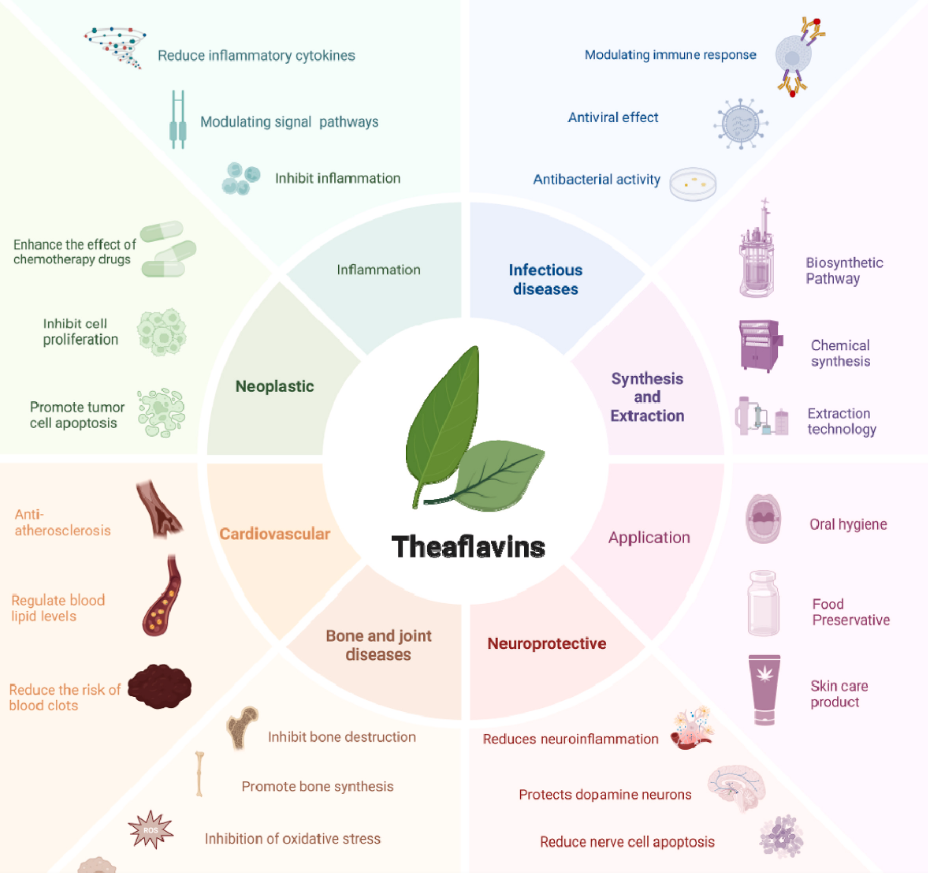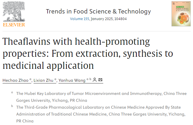 刊发该论文的期刊为食品、农业与生物科学研究领域的顶尖期刊,其科研影响因子为16.001,具有很强国际学术影响力。该论文梳理了天然产物茶黄素的最新研究进展,介绍了茶黄素的提取与合成技术、健康效益、生物利用度和工业应用;特别详细地分析了目前的合成方法,包括提取和纯化技术。重要的是,论文讨论了茶黄素在人类疾病治疗中的应用前景,展望了茶黄素在健康管理和疾病预防中的巨大效益。