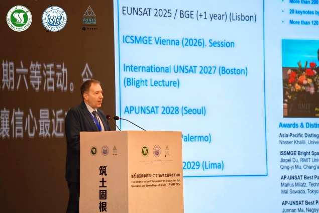 闭幕式上,会议组织委员会主席、同济大学王琼教授主持了闭幕式、作大会总结报告,并欢迎专家学者们参加2029年在香港理工大学举办的第七届会议。学术委员会主席法国国立路桥大学崔玉军教授、同济大学叶为民教授、西班牙UPC大学Enrique Romero教授为优秀研究生报告颁奖。