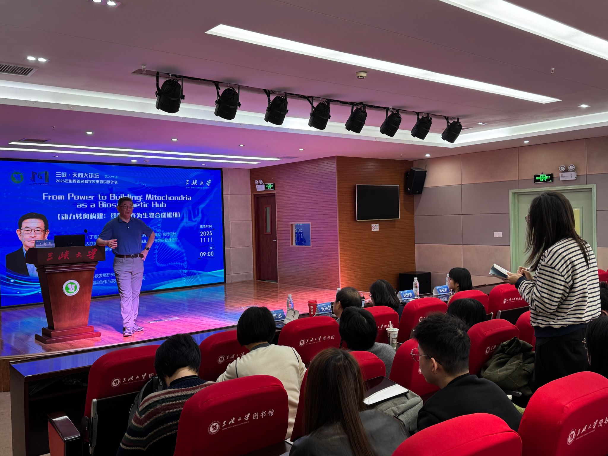 11日上午,丁寒飞教授在“三峡·天问大讲坛(第229讲)”,以《动力转向构建:线粒体作为生物合成枢纽(From Power to Building: Mitochondria as a Biosynthetic Hub)》为题,为我校百余名师生带来了一场高水平的学术讲座。讲座由基础医学院执行院长赵海霞主持,宁波大学附属第一医院神经内科学科带头人查运红、基础医学院副院长张世忠、留学生教育专项工作负责人邹黎黎悉数出席。丁寒飞教授围绕线粒体在癌细胞代谢中的关键作用,系统阐述了其团队在癌症代谢研究领域的最新成果,内容深入浅出,现场师生反响热烈。讲座结束后,丁寒飞教授与在场师生进行了深入互动。多位师生就癌症代谢的调控机制、研究方法及临床应用等问题踊跃提问,丁寒飞教授一一作出详细解答,现场学术氛围浓厚。
