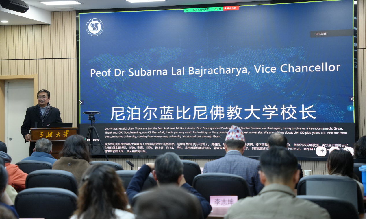 在主题发言环节,来自尼泊尔特里布文大学、蓝比尼佛教大学、尼泊尔医学会、尼泊尔议会党国际关系研究院的专家学者,与三峡大学尼泊尔研究中心的研究团队,分别从文化交流、经贸合作、区域安全等角度分享了研究成果。