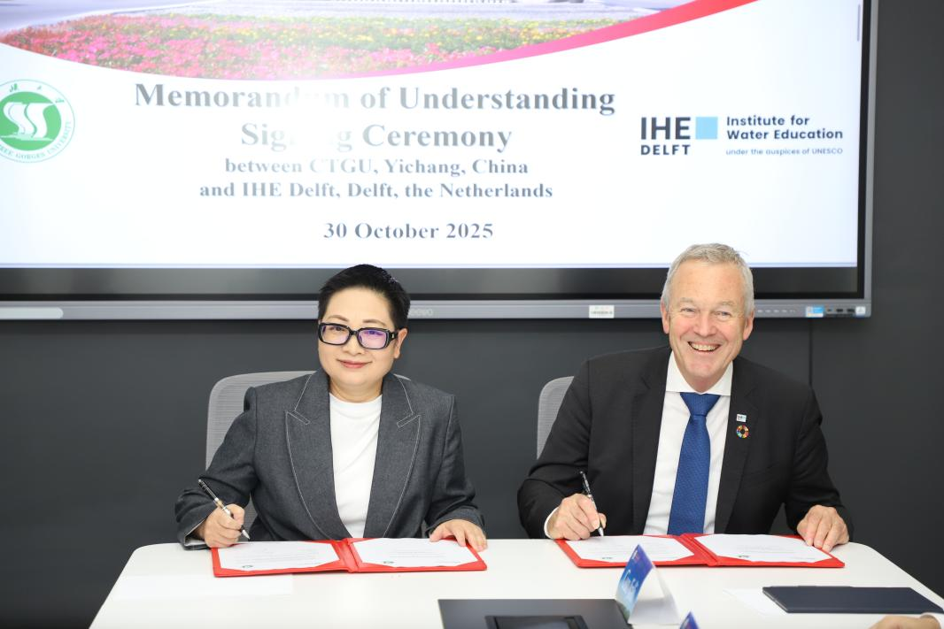 报告会结束后,双方就水资源领域的科研合作、能力建设及未来发展进行了深入探讨。在亲切友好的氛围中,黄艳校长与Eddy Moors校长共同签署了两校合作备忘录(MoU),为双方未来在科研创新、师生交流、平台共建等方面的实质性合作奠定了基础。