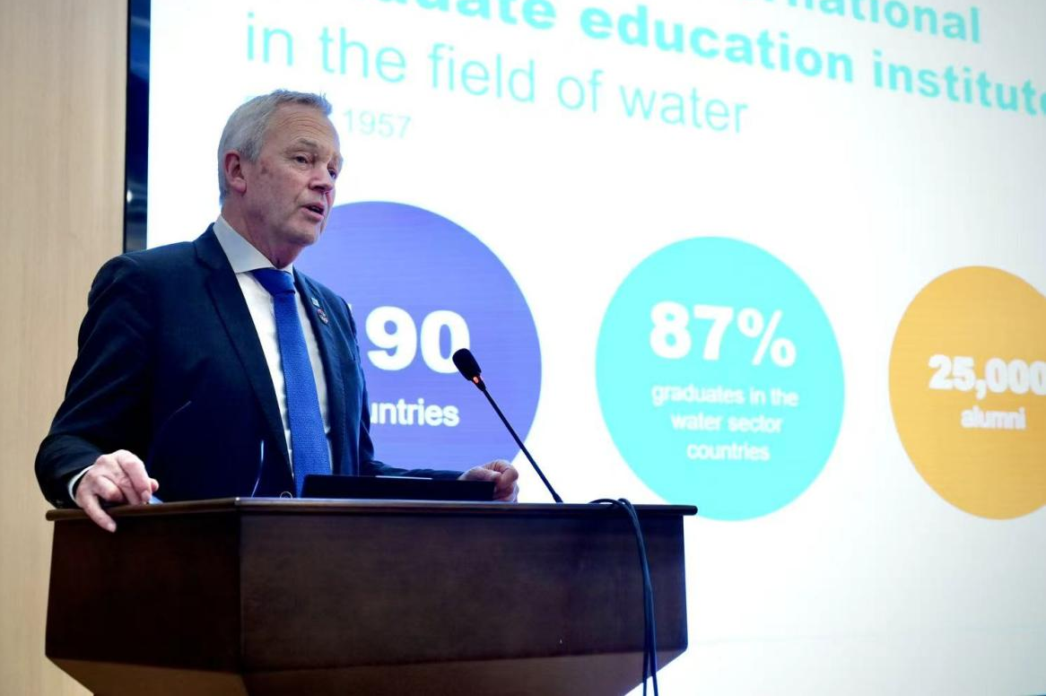 Eddy Moors校长以“IHE简介及其在能力建设中的角色,以及气候变化与水资源的专题报告”为题,系统介绍了IHE在全球水教育领域的领先地位与重要使命,分享了气候变化背景下水资源管理的前沿进展与挑战。Yangxiao Zhou博士作了题为“IHE在华活动概述与未来展望”的报告,回顾了IHE与中国的长期合作成果,并对未来在联合科研与人才培养等领域的深化合作提出展望。