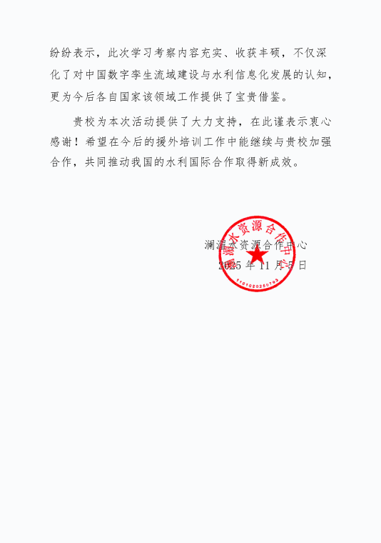 澜湄水资源合作中心在感谢信中特别对三峡大学为本次活动提供的大力支持表示谢意,并希望未来继续深化合作,共同推动我国水利国际合作取得新成效。这封感谢信不仅是对三峡大学援外培训工作的充分肯定,也是中国水利技术与经验具有国际影响力的有力印证。