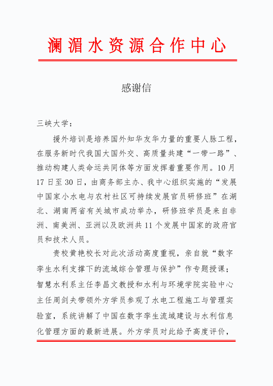本网讯(通讯员 李昌文)2025年11月5日,澜湄水资源合作中心向三峡大学发来感谢信,对我校在“发展中国家小水电与农村社区可持续发展官员研修班”援外培训中所作的突出贡献表示诚挚感谢。此次培训不仅为来自11个发展中国家的官员和技术人员搭建了学习交流的平台,也彰显了三峡大学在水利水电领域的国际影响力与责任担当。
