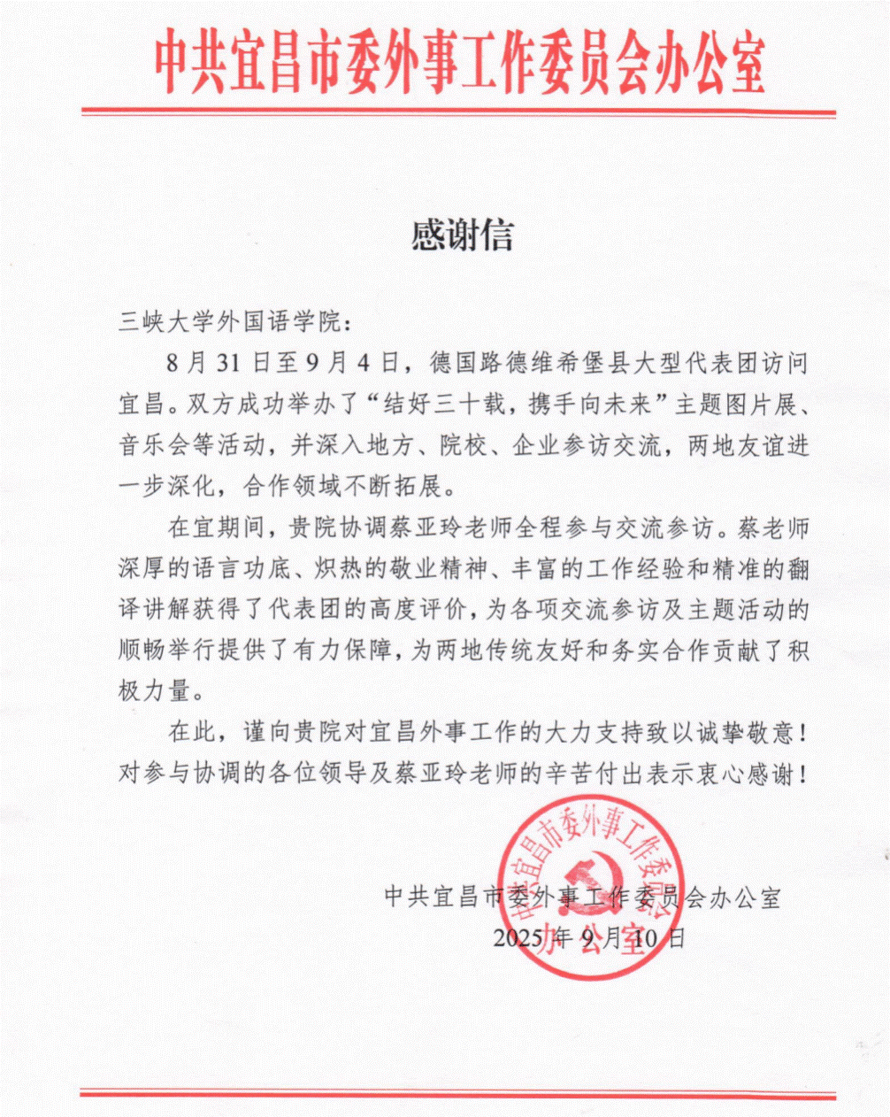 本网讯(通讯员 胡新颖)近日,中共宜昌市委外事工作委员会办公室向我校外国语学院发来感谢信,对学院教师在宜昌市对德交流活动中提供的专业翻译服务表示衷心感谢,对他们在助力宜昌国际化进程中的积极作用表示高度肯定。