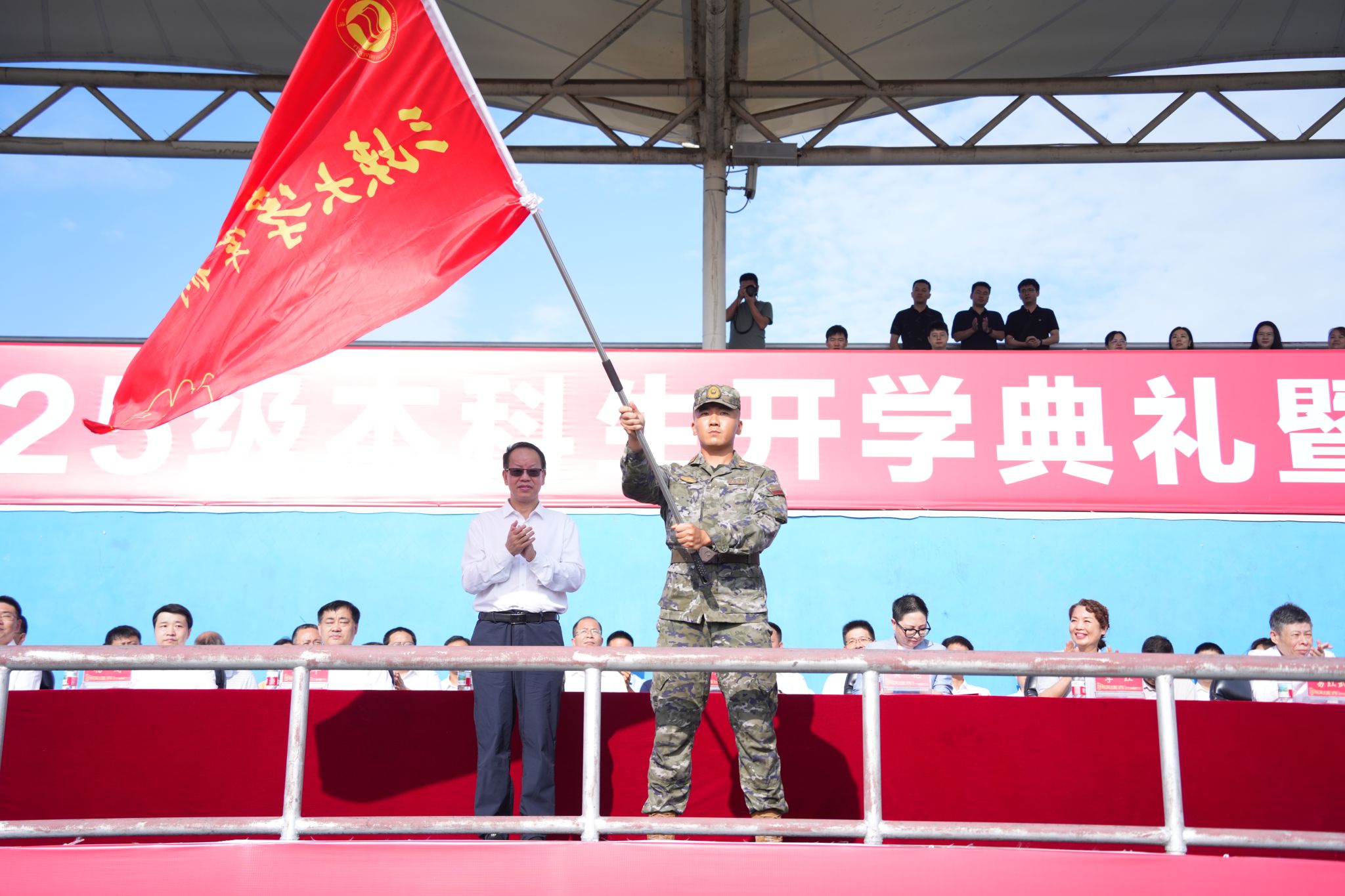党委书记何伟军向军训团授旗,并宣布2025级本科生集中军事训练正式开始。