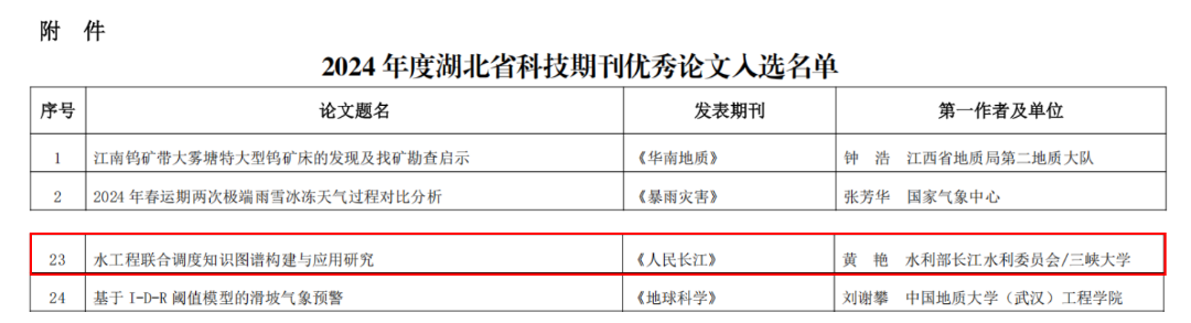 本网讯(通讯员 马国贞 任强)8月26日,湖北省科学技术协会指导、湖北省科学技术期刊编辑学会组织实施的2024年度湖北省科技期刊优秀论文遴选结果正式揭晓。黄艳教授2024年发表的《水工程联合调度知识图谱构建与应用研究》论文成功入选。该文发表于《人民长江》2024年第9期,是“水工程智慧联合调度”专题论文。