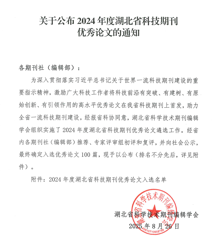 本次优秀论文评选活动,旨在深入贯彻落实习近平总书记关于世界一流科技期刊建设的重要指示精神,激励广大科技工作者将科技前沿有突破、有建树、有原始创新和有引领作用的高水平优秀论文在湖北省科技期刊上首发,助力湖北省一流科技期刊建设。遴选工作按学科分为理学、工学、农学、医学与生命科学、交叉学科五类。论文类型涵盖基础研究、应用研究和综合评述。经过期刊社(编辑部)推荐、专家评审组初评和复评,并向社会公示,最终评选出100篇优秀论文。