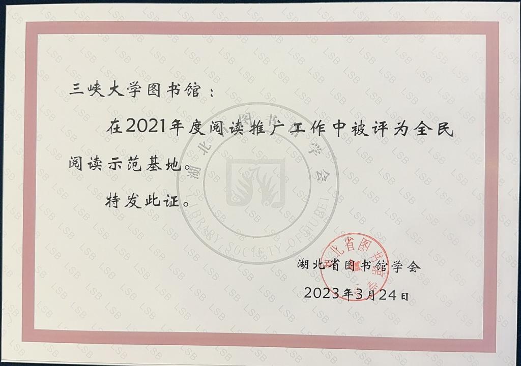 本网讯 3月30日,在湖北咸宁召开的“湖北省图书馆学会2022年度学术年会”中,三峡大学图书馆在2021年度阅读推广工作中荣获“全民阅读示范基地”称号。