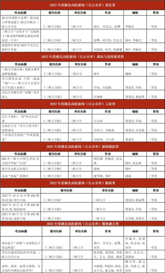 本届湖北高校新闻奖共分为消息、通讯与深度报道、言论、新闻摄影、版面、媒体融合六类奖项,经评选委员会严格评定,我校《3D打印别墅不是梦!国内最大单体混凝土3D打印机在三峡大学首发》《三峡大学“宜优9号”高粱熟了!推动国内酿酒高粱新品种前进一大步!》获消息类一等奖,《600名三峡大学师生帮助25万尾中华鲟“回家”》获新闻摄影类一等奖,《国内最大“神器”!未来的房子将这样建!》获媒体融合类一等奖。